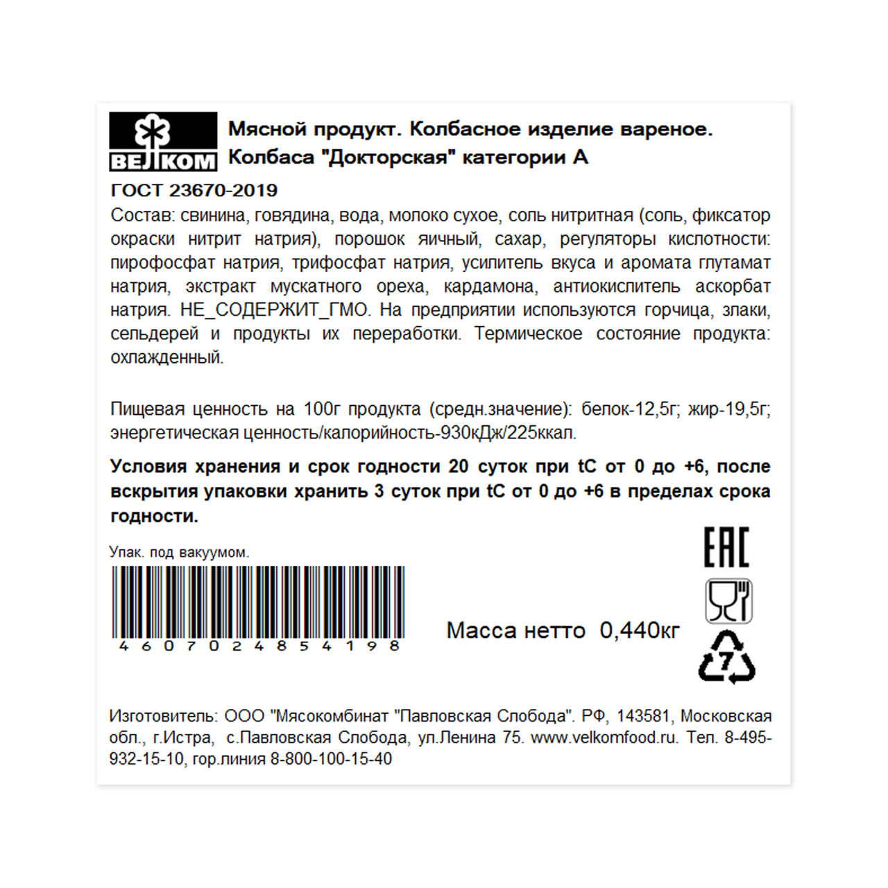 Колбаса Докторская ВЕЛКОМ, 440 г – продукт категории А, изготовленный по ГОСТу.и Не содержит сои и генномодифицированных компонентов. Благодаря безупречному качеству, удивительному вкусу и аромату колбаса пользуется востребованностью среди покупателей. Докторская колбаса имеет приятный цвет, без ярких красок. Продукт не содержит шпика. Идеально подходит для приготовления различных блюд. Имеет в меру соленый вкус. Удобная упаковка позволяет сохранить высокое качество продукта.