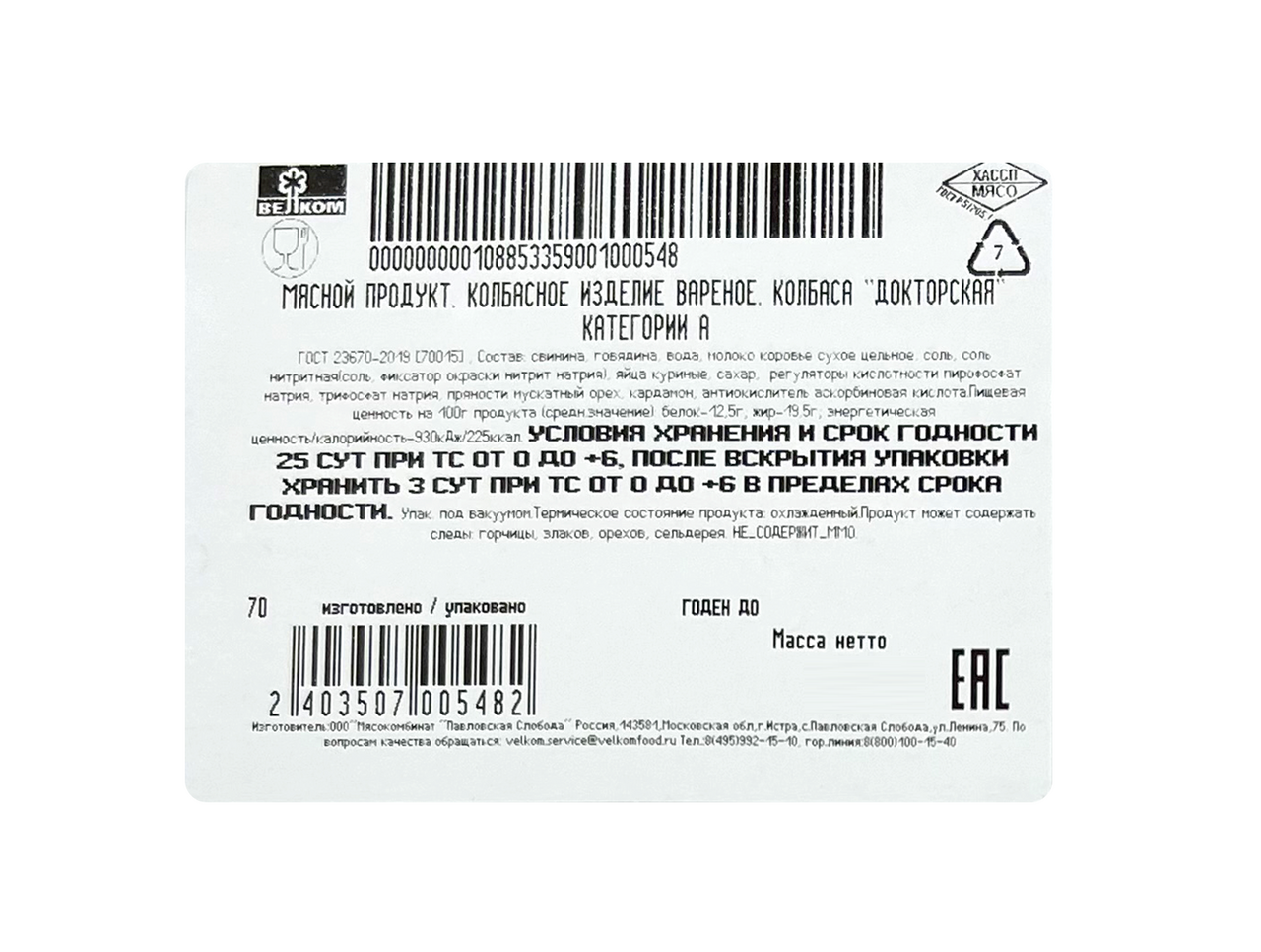 Колбаса Велком Докторская вареная в натуральной оболочке