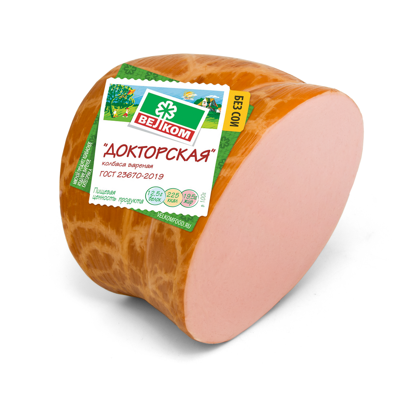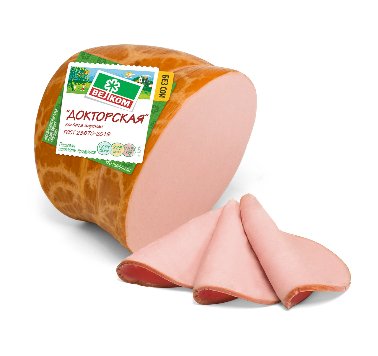 Колбаса Докторская Велком в натуральной оболочке является продукцией известного комбината, производящего мясные деликатесы без ГМО и сои. Докторская колбаса создана по классическому рецепту с применением современных технологий. Это отличный диетический завтрак для всей семьи, который можно сочетать с овощами, зеленью, использовать для бутербродов. Продукт обладает нежным вкусом и легким пряным ароматом, он легко нарезается на тонкие пластины, которые смотрятся аппетитно за счет приятного розового цвета и однородной текстуры.