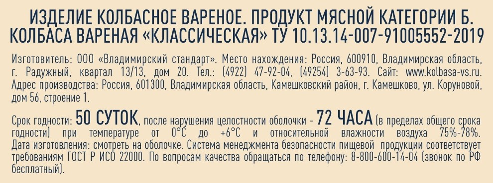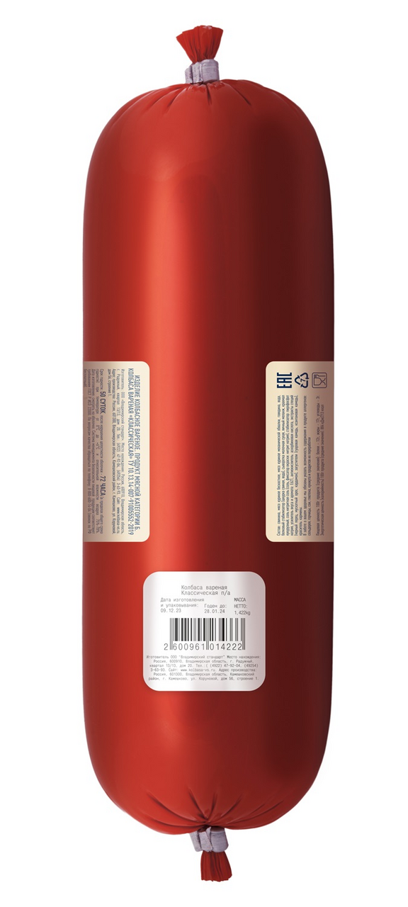 Колбаса Владимирский стандарт Классическая вареная, ~1.4кг