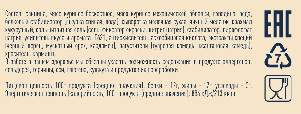 Мясо куриное кусковое, свинина, говядина, шпик, вода, яичный порошок, молоко сухое обезжиренное, посолочно-нитритная смесь соль, фиксатор окраски нитрит натрия, комплексная пищевая добавка регуляторы кислотности трифосфат натрия и пирофосфат натрия.