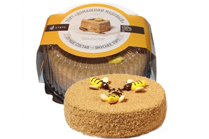 Мука пшеничная хлебопекарная высшего сорта, сахар белый, вода питьевая, молоко цельное сгущенное с сахаром цельное молоко, обезжиренное молоко, сахар сахароза, лактоза, спред растительно - жировой рафинированные дезодорированные растительные масла пальмовое, подсолнечное, вода, соль, эмульгатор Е471, консерванты Е200, Е211, ароматизатор, краситель Е160а, регулятор кислотности Е330, продукты яичные, маргарин, мед натуральный, смесь сухая для приготовления отделочного полуфабриката: заварной крем, разрыхлитель: гидрокарбонат натрия, ароматизаторы пищевые: ванилин, Мед, регулятор кислотности: кислота лимонная моногидрат.