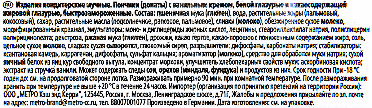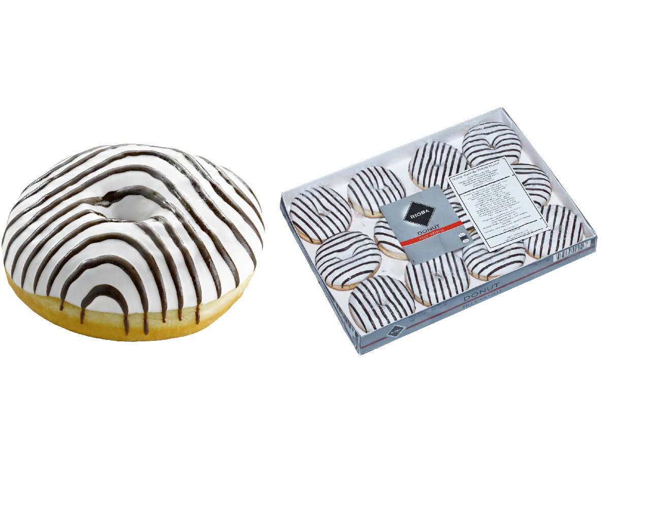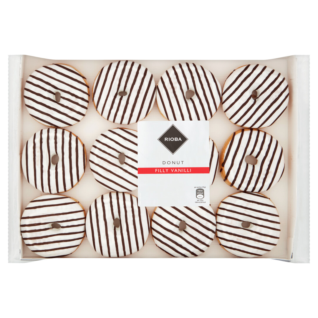 RIOBA Донаты (пончики) с глазурью и ванильным кремом, 76гр х 12шт, замороженные — это сладкий пончик, который продается в замороженном виде. Сверху кондитерское изделие покрыто белой глазурью с полосами темной глазури. Внутри ванильный крем. Изделие подходит для использования в кафе, ресторанах, для ланчей в гостиницах, а также в кругу семьи дома. Удобная упаковка вмещает в себя 12 штук изделий. Продукт готов к употреблению уже через 60 минут после размораживания. Процесс размораживания должен происходить при комнатной температуре. Не рекомендуется замораживать снова.