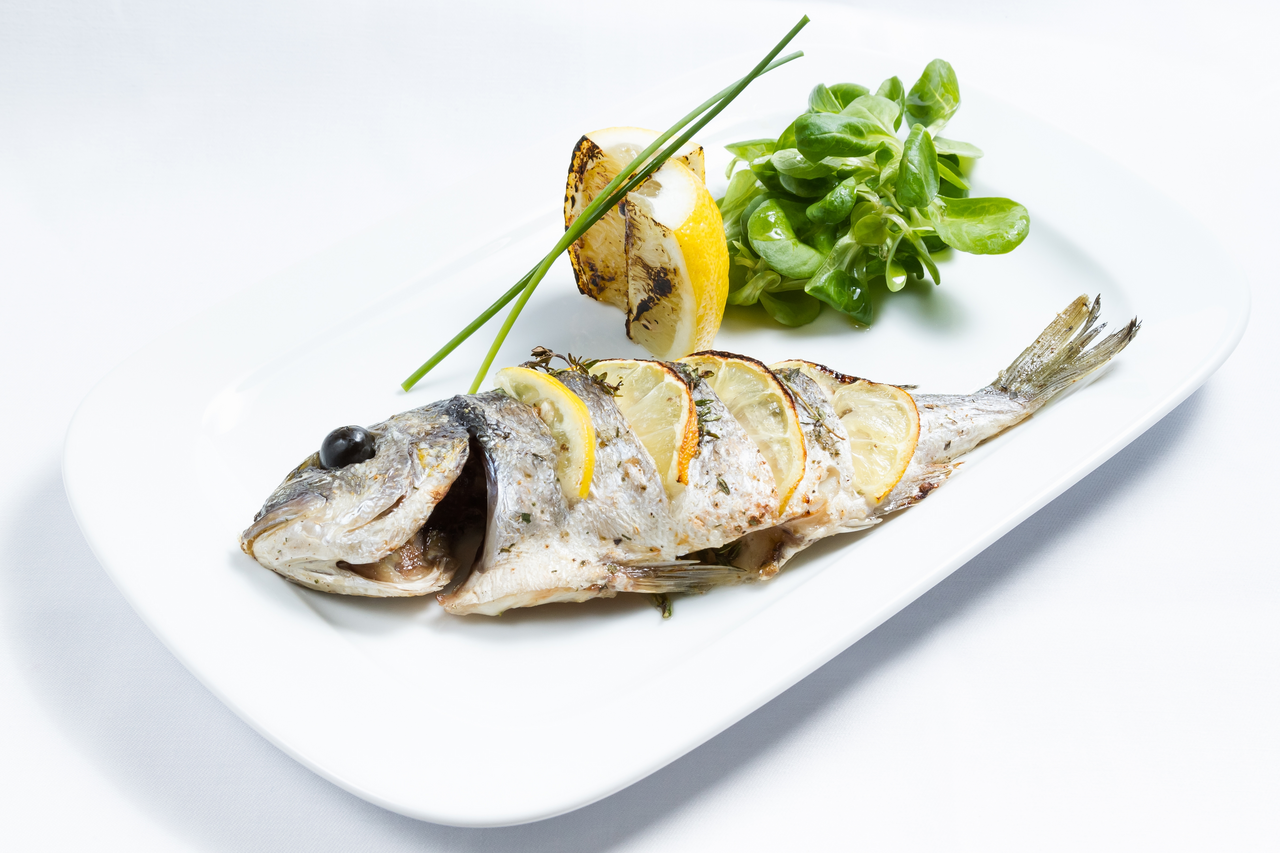 Дорада, ~300-400 г – рыба рода спаров, которая обитает в Средиземном море и в восточной части Атлантического океана. Спина имеет темно-серую окраску, которая переходит к брюшку в серебристо-серую. Дорада известна достаточно давно и всегда была одной из самых популярных рыб Средиземноморья. Мясо рыбы считается изысканным деликатесом. Оно плотное, нежное, слегка розоватого цвета и имеет приятный сладковатый вкус. Костей при этом мало. Благодаря минимальной жирности и низкой калорийности дорада по праву считается диетическим продуктом. Кроме того, она содержит легкоусвояемый белок, который важен для организм, так как участвует в строительстве клеток. Также в составе дорада имеются различные минералы, в частности, калий и цинк, которые улучшают состояние кожных покровов. Готовят эту морскую рыбу разными способами, главное – не подвергать ее слишком долгой тепловой обработке. Часто ее запекают на гриле, уложив внутрь пряные травы – готовое блюдо подают с овощами и лимоном. Дораду можно приготовить и в духовке, предварительно поместив рыбу в фольгу, или в пароварке. Некоторые гурманы предпочитают рыбу, зажаренную на сковороде. Готовить ее рекомендуется целиком, так как это позволит максимально сохранить вкус и сочность рыбы. Прекрасным дополнением к ней станут овощи на гриле и легкие салаты. В холодильнике свежую рыбу можно хранить около двух дней при условии, что она почищена и выпотрошена.