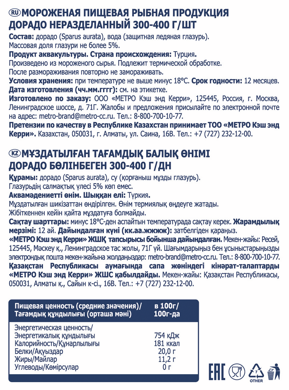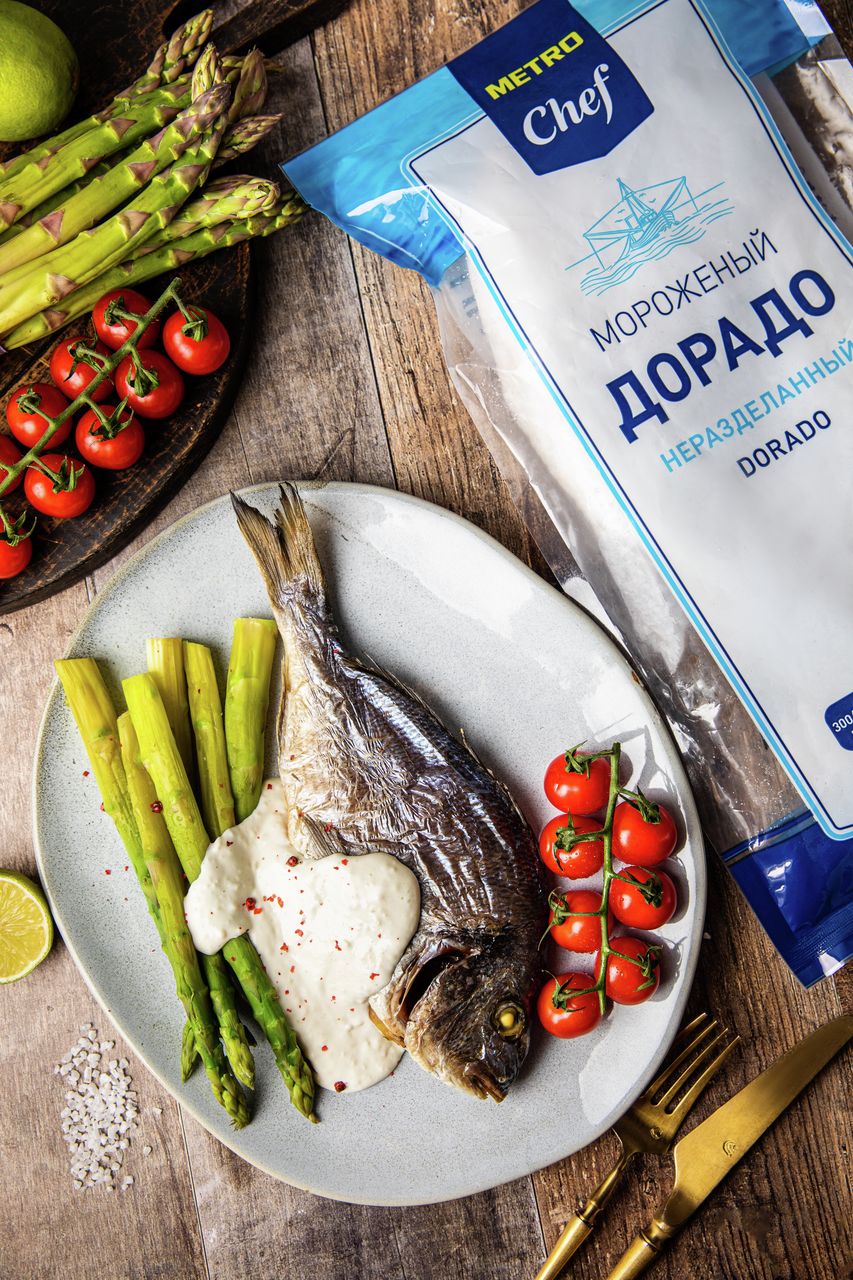 METRO Chef Дорадо неразделанный свежемороженый ~300-400 – это вкусная рыба с нежным розовым мясом. Она относится к семейству спаровых, обитает в Средиземном море. Блюда из нее считаются деликатесом в кухнях разных стран. Мясо этой рыбы нежное, во вкусе присутствуют легкие сладковатые нотки. В нем содержится большое количество полезных для организма веществ: белков, незаменимых аминокислот, микро- и макроэлементов, витаминов, полиненасыщенных жирных кислот. Его рекомендуют употреблять регулярно взрослым и детям. Оно низкокалорийное, поэтому может присутствовать в меню во время диет. Костей мало, что облегчает разделку тушки. Из дорадо готовят много разных блюд. Ее запекают, варят, жарят (на сковороде и на гриле), тушат, используют для приготовления первых блюд и салатов. Она отлично сочетается с разными специями, соусами, зеленью. Их обязательно добавляют во время приготовления, но в ограниченном количестве, чтобы не потерять основной вкус нежного мяса. Товары под брендом METRO Chef разработаны и протестированы совместно с представителями ресторанного бизнеса. Это продукты, созданные шеф-поварами для шеф-поваров и людей, увлеченных гастрономией. Это качество, отвечающее высоким требованиям профессионалов ресторанного бизнеса. Это большие упаковки и оптовые цены.