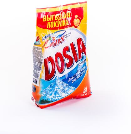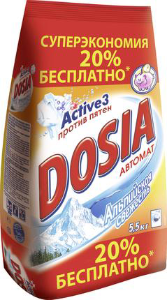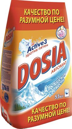 Синтетическое моющее средство Dosia "Альпийская Свежесть" автомат, 5,5кг.Средство моющее синтетическое порошкообразное для автоматическихстиральных машин. Не предназначен для стирки изделий из шерсти и шелка.Новая Dosia Active 3 содержит три активных компонента против различныхтипов пятен, которые: воздействуют на волокна ткани и удаляют общиезагрязнения, удаляют сложные пятна, отбеливают и придают кристальнуюбелизну.Следуйте рекомендациям на ярлыках одежды при выборе температуры стирки.Белое белье стирайте отдельно от цветного.Состав: 5% или более, но менее 15% кислородсодержащий отбеливатель, цеолиты, менее 5% неионогенные ПАВ, анионные ПАВ. Дополнительно: энзимы, оптический отбеливатель, антивспениватель, отдушка.Хранить в сухом месте, недоступном для детей и вдали от пищевых продуктов. При попадании в глаза немедленно промыть проточной водой и обратиться к врачу.Срок хранения 2 года.