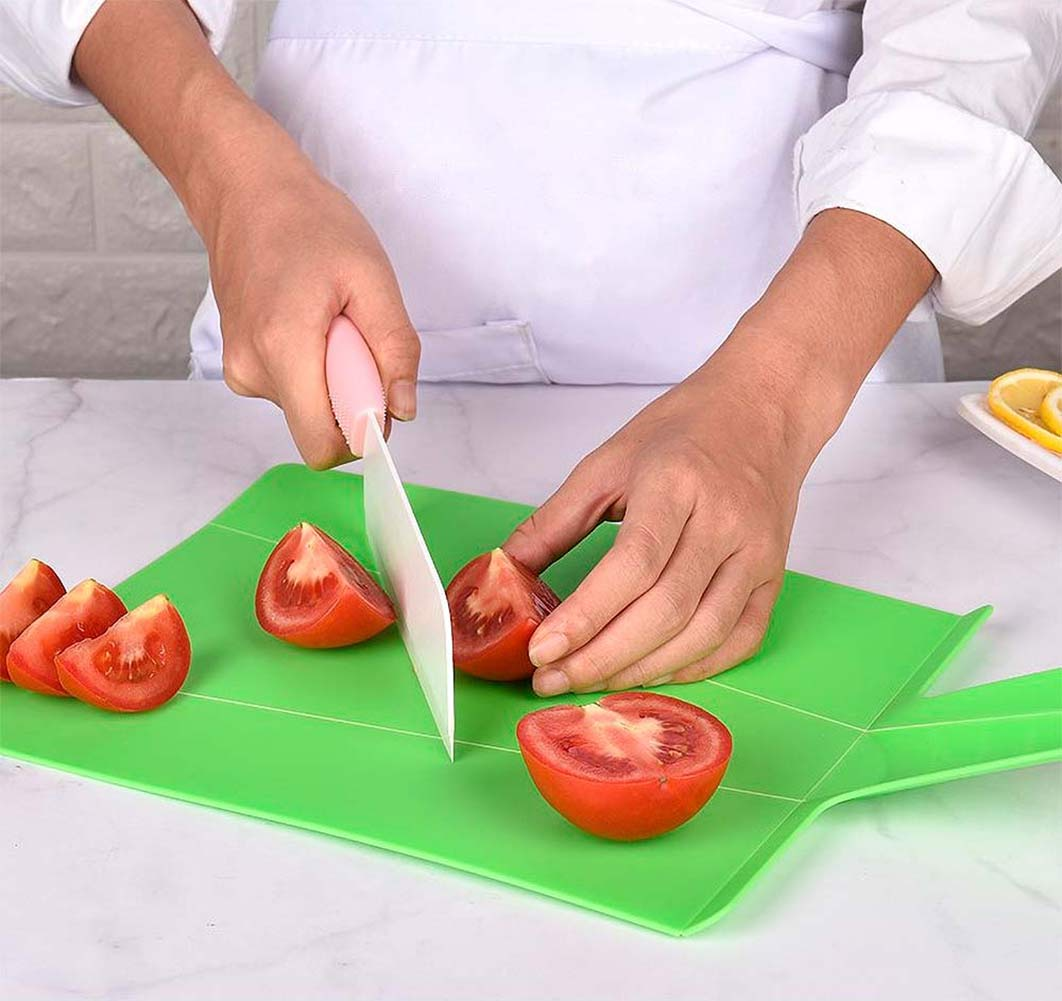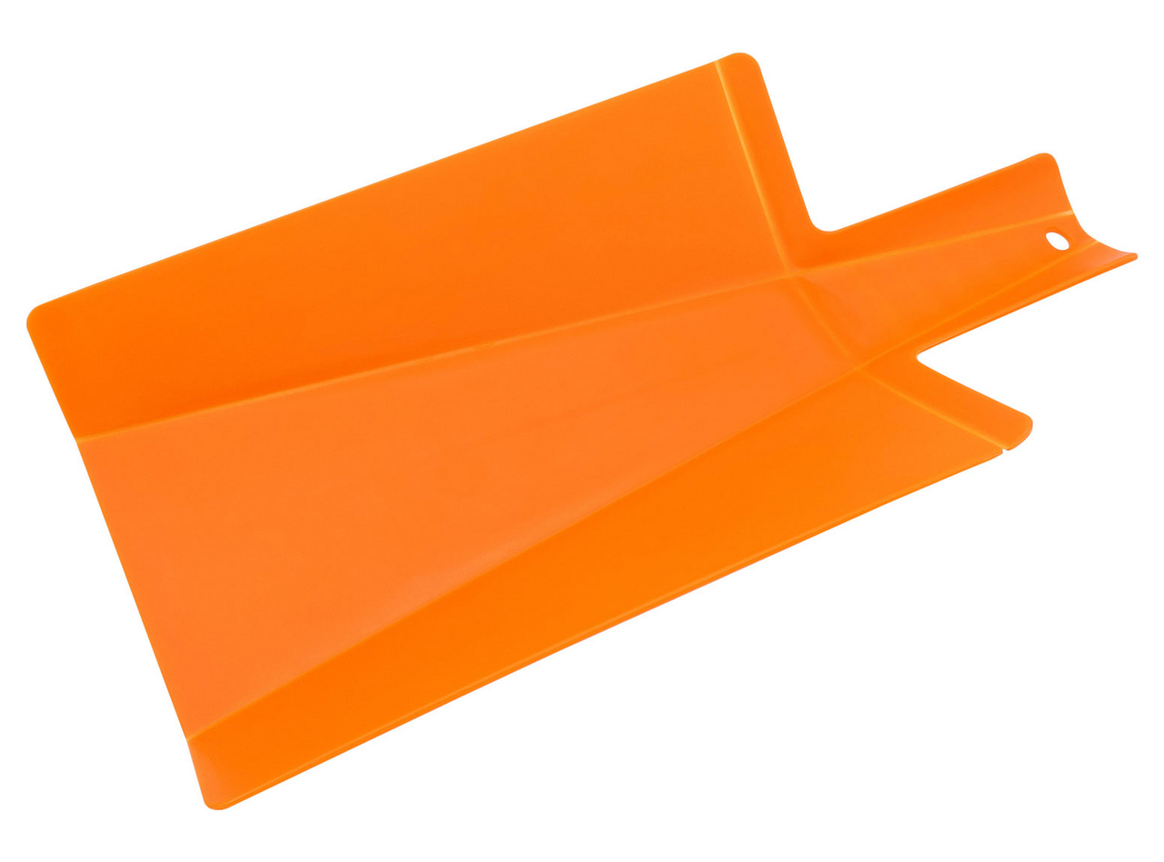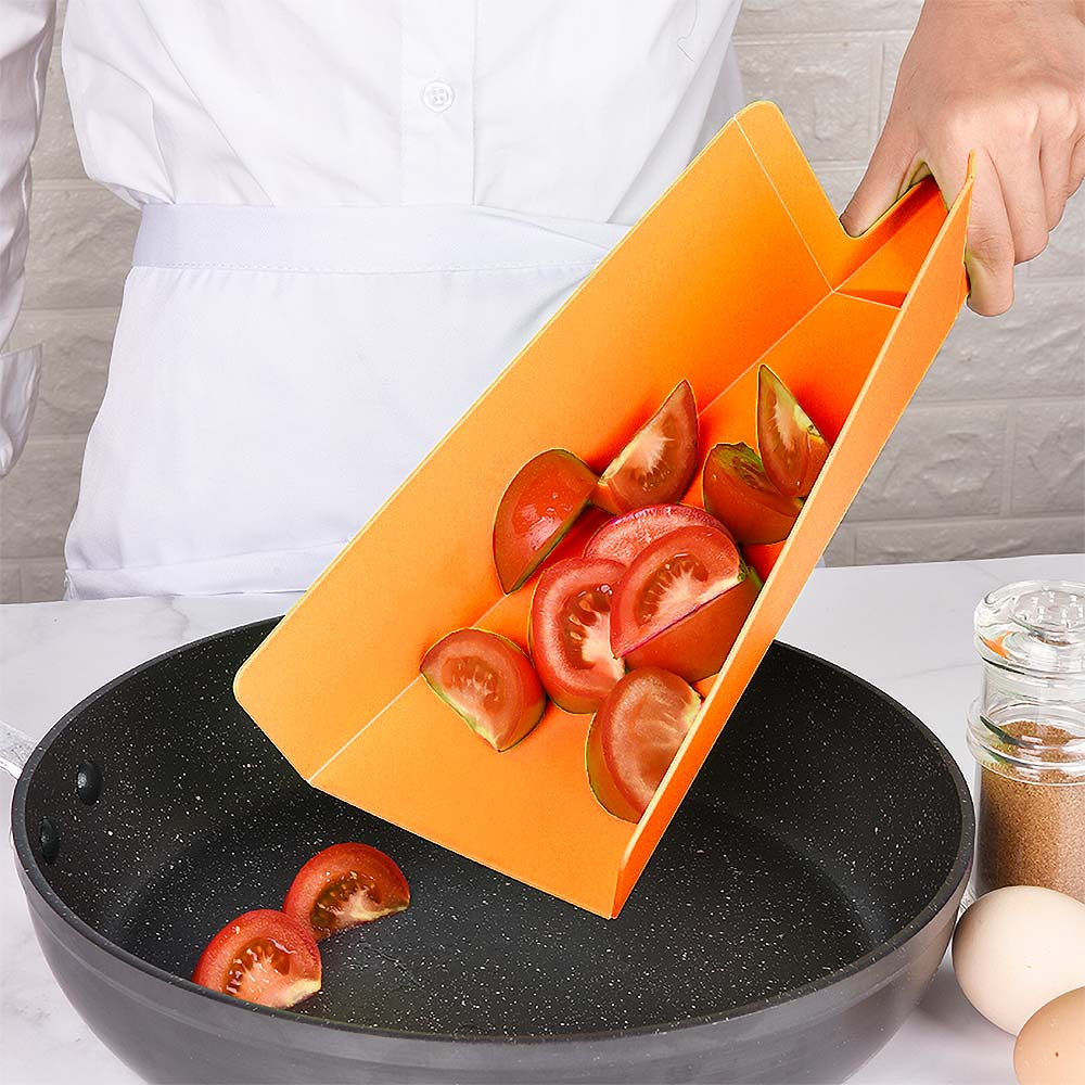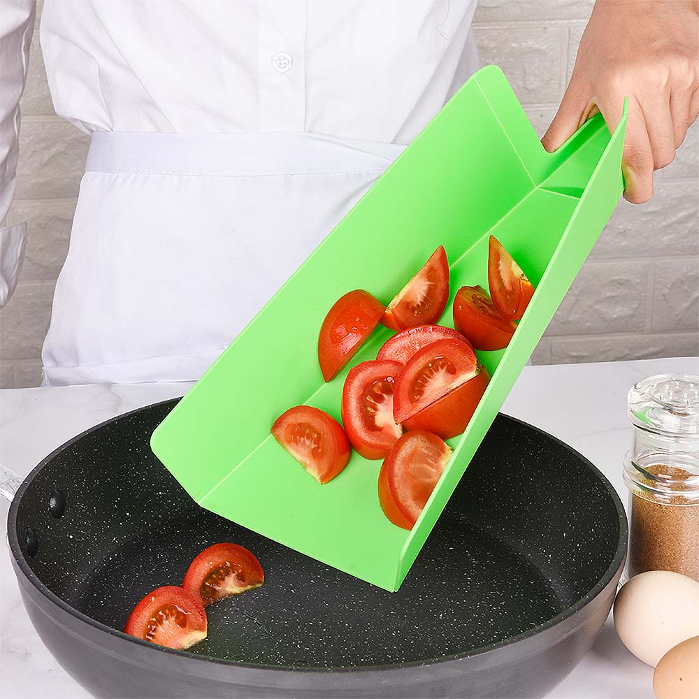 Складная разделочная доска-трансформер предназначена именно для того, чтобы быстро и комфортно перенести нарезанные продукты в любую посуду.Для нарезки поставьте ручку доски в вертикальное положение. Вы получите ровную поверхность для нарезки любых продуктов. Когда нарезка будет готова, опустите ручку доски и сожмите ее по бокам. Доска превратится в удобный совочек. Нарезанные продукты легко высыпать в кастрюлю или сковороду, не используя нож или поварешку. Доску можно использовать для сыпучих продуктов. Например, набирать муку, сахар или крупы с больших емкостей можно с помощью этого приспособления. Преимущества: легко превращается в пищевой совок; подходит для обработки любых пищевых продуктов; упрощает процесс приготовления блюда и избавляет от дополнительной уборки стола; легко моется, не впитывает в себя запахи продуктов