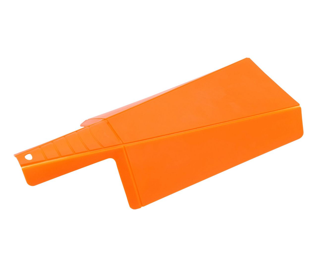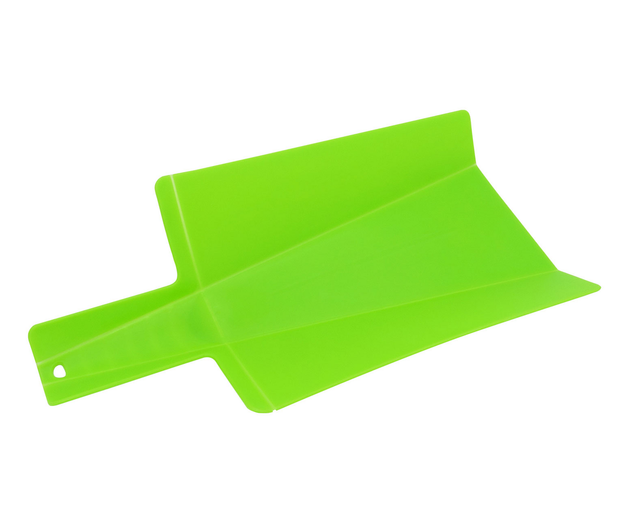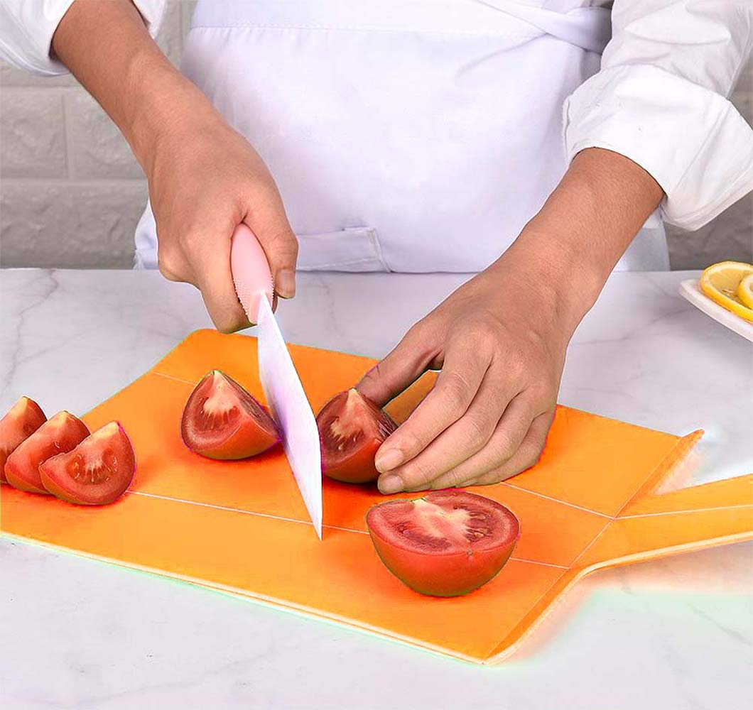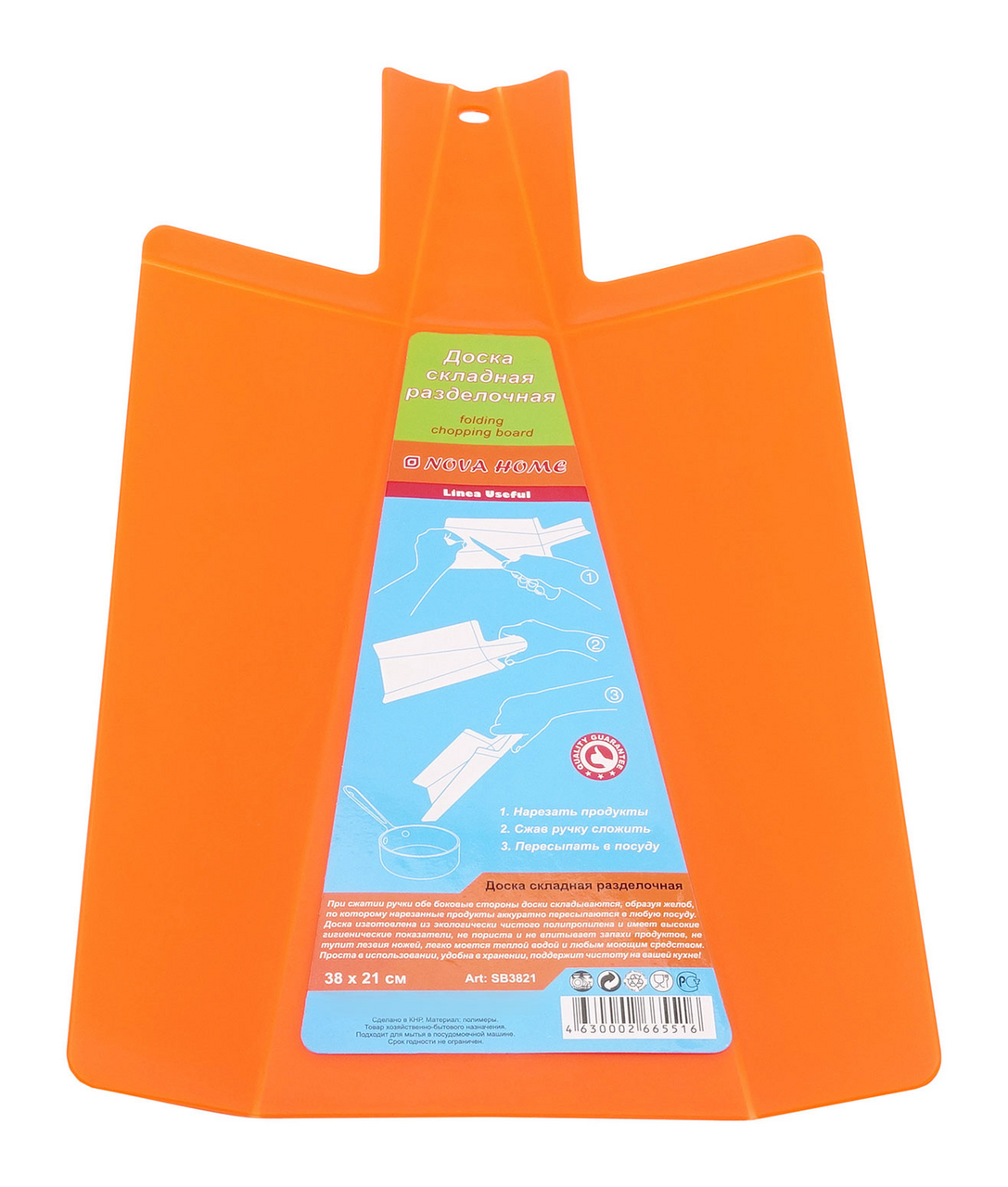 Складная разделочная доска-трансформер предназначена именно для того, чтобы быстро и комфортно перенести нарезанные продукты в любую посуду.Для нарезки поставьте ручку доски в вертикальное положение. Вы получите ровную поверхность для нарезки любых продуктов. Когда нарезка будет готова, опустите ручку доски и сожмите ее по бокам. Доска превратится в удобный совочек. Нарезанные продукты легко высыпать в кастрюлю или сковороду, не используя нож или поварешку. Доску можно использовать для сыпучих продуктов. Например, набирать муку, сахар или крупы с больших емкостей можно с помощью этого приспособления. Преимущества: легко превращается в пищевой совок; подходит для обработки любых пищевых продуктов; упрощает процесс приготовления блюда и избавляет от дополнительной уборки стола; легко моется, не впитывает в себя запахи продуктов