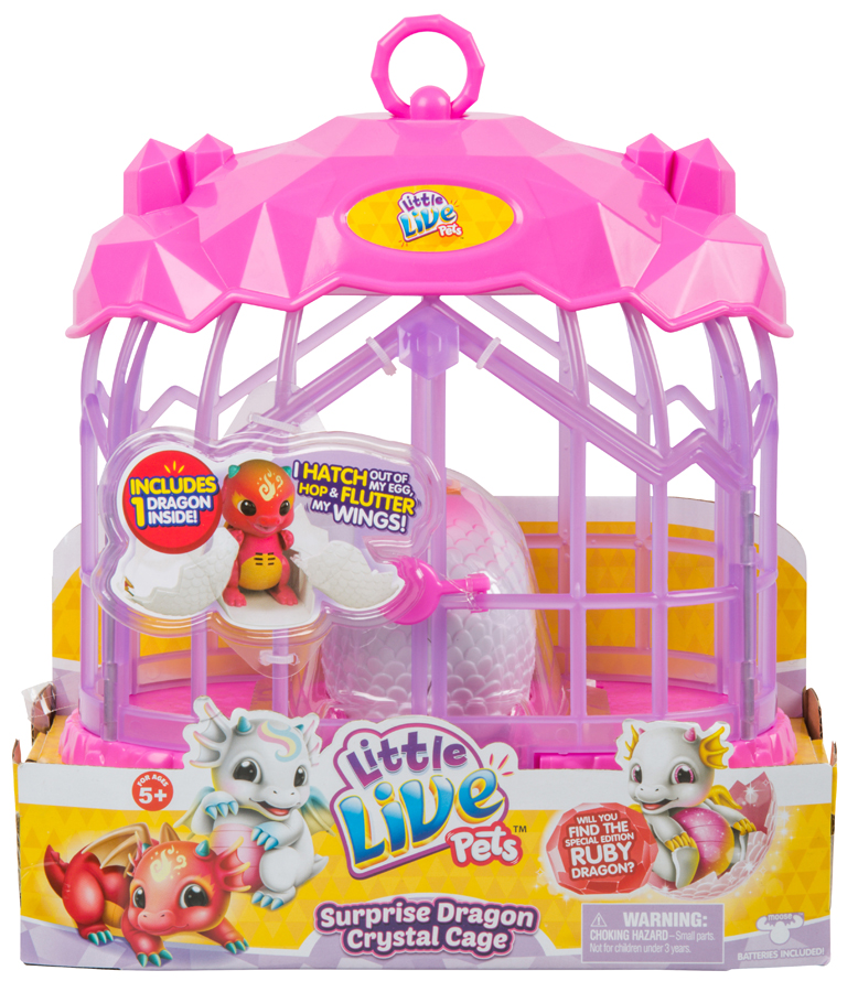В наборе имеется один дракончик, открывающаяся от кнопочки яичная скорлупа и клетка-домик для вашего постояльца. Дракончик умеет не только вылупляться из яйца, а еще пищать, рычать, махать крылышками и весело прыгать по кругу. А еще в этой игрушке есть элемент сюрприза – вам может попасться один из двух стандартных типажей белой или красной окраски, а если повезет – в яйце вы найдете эксклюзивного дракончика Руби ограниченной серии. Комплектация : клетка, дракон, яйцо, батарейки Возрастное ограничение 5+