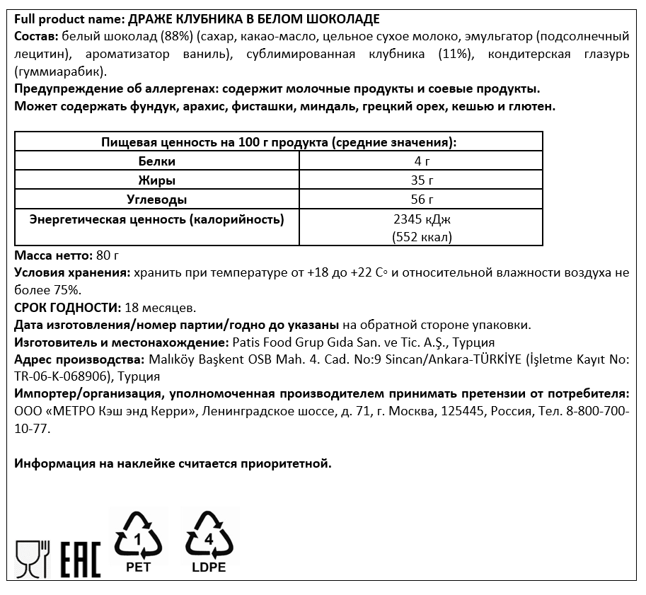 Белый шоколад (88%) (сахар, какао-масло, цельное сухое молоко, эмульгатор (подсолнечный лецитин), ароматизатор ваниль), сублимированная клубника (11%), кондитерская глазурь (гуммиарабик).