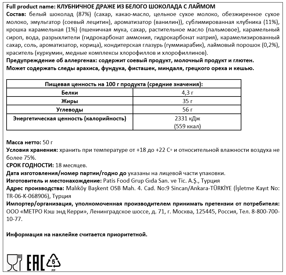 Белый шоколад сахар, какао-масло, цельное сухое молоко, обезжиренное сухое молоко, эмульгатор соевый лецитин, ароматизатор ванилин, сублимированная клубника, крошка карамельная пшеничная мука, сахар, растительное масло пальмовое, карамельный сироп, вода, разрыхлители гидрокарбонат аммония, гидрокарбонат натрия, карамелизированный сахар, соль, ароматизатор, корица, кондитерская глазурь гуммиарабик, лаймовый порошок, краситель куркумин, медные комплексы хлорофиллов и хлорофиллинов.