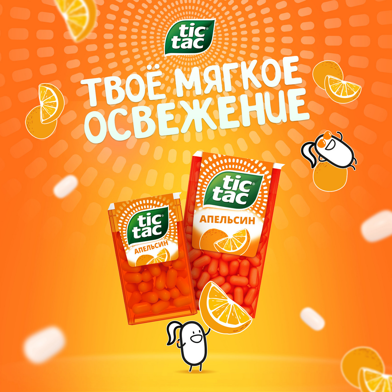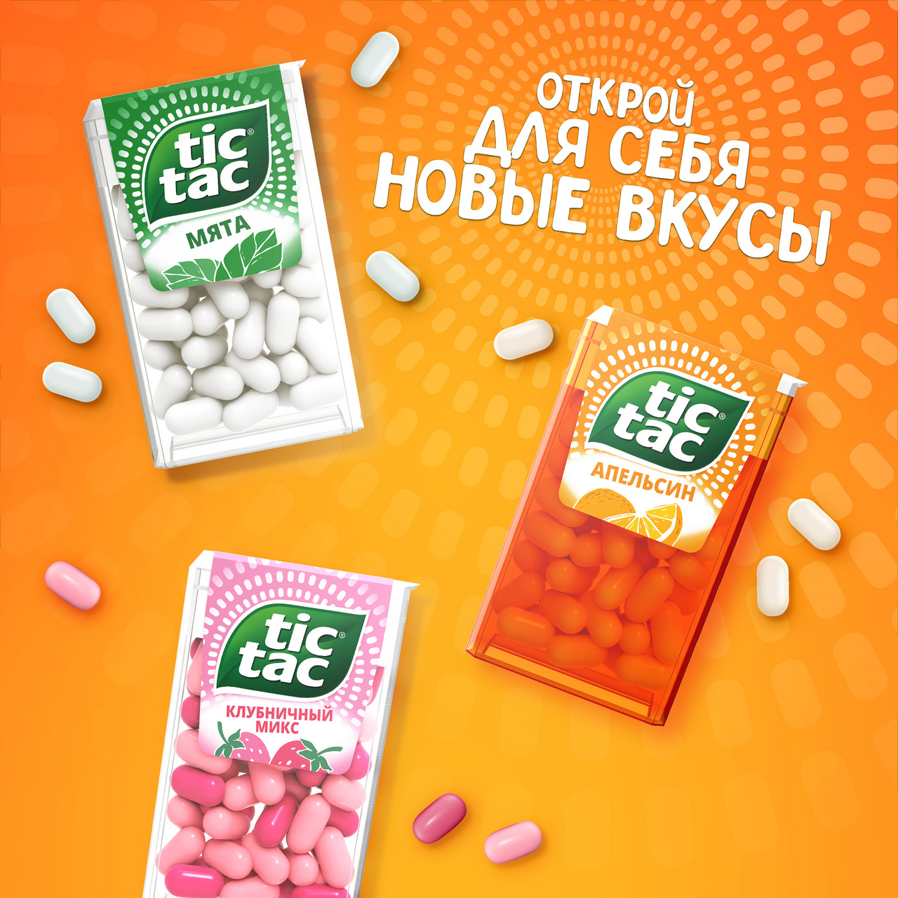 Tic Tac – это освежающее драже c ярким и бодрящим вкусом в удобной упаковке. Tic Tac пришел на российский рынок в 90-ые годы 20 века и по сей день является продуктом, который хорошо знают и любят как взрослые, так и дети. Мята, Апельсин, Клубничный, Фруктовый и Ягодный Микс – калейдоскоп вкусов Tic Tac дарит заряд свежести и позитивной энергии. Под тонкой оболочкой скрывается уникальный вкус и источник свежести. Это больше, чем двойной эффект и второе дыхание! Яркое драже Tic Tac с незабываемыми свежими вкусами поможет наполнить твой день яркими моментами!