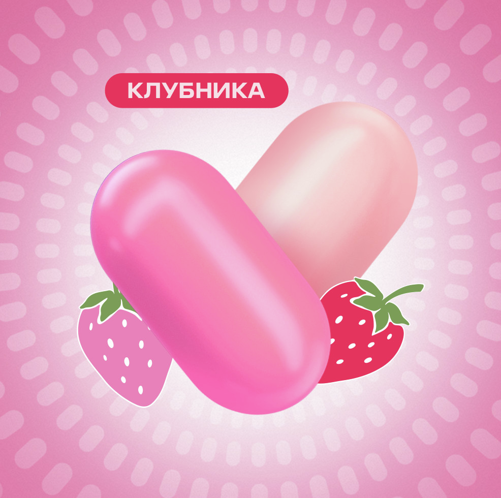 Сахар, мальтодекстрин, регуляторы кислотности: E334, E296, E330; загуститель: E414, рисовый крахмал, фруктоза, ароматизаторы и эфирные масла, агент антислеживающий: E470, сухая клубника, краситель: E162, сухой лимонный сок, глазирователь: E903.