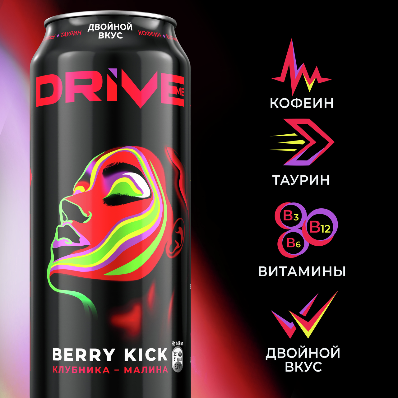 Drive Me Berry Kick - тонизирующий напиток с двойным ягодным вкусом клубника-малина. В составе кофеин, таурин и витамины группы B.Для заряда энергии и бодрости в течение дня и не только.Твой драйв самовыражения с тонизирующими (в т.ч. энергетическими) напитками Драйв Ми.