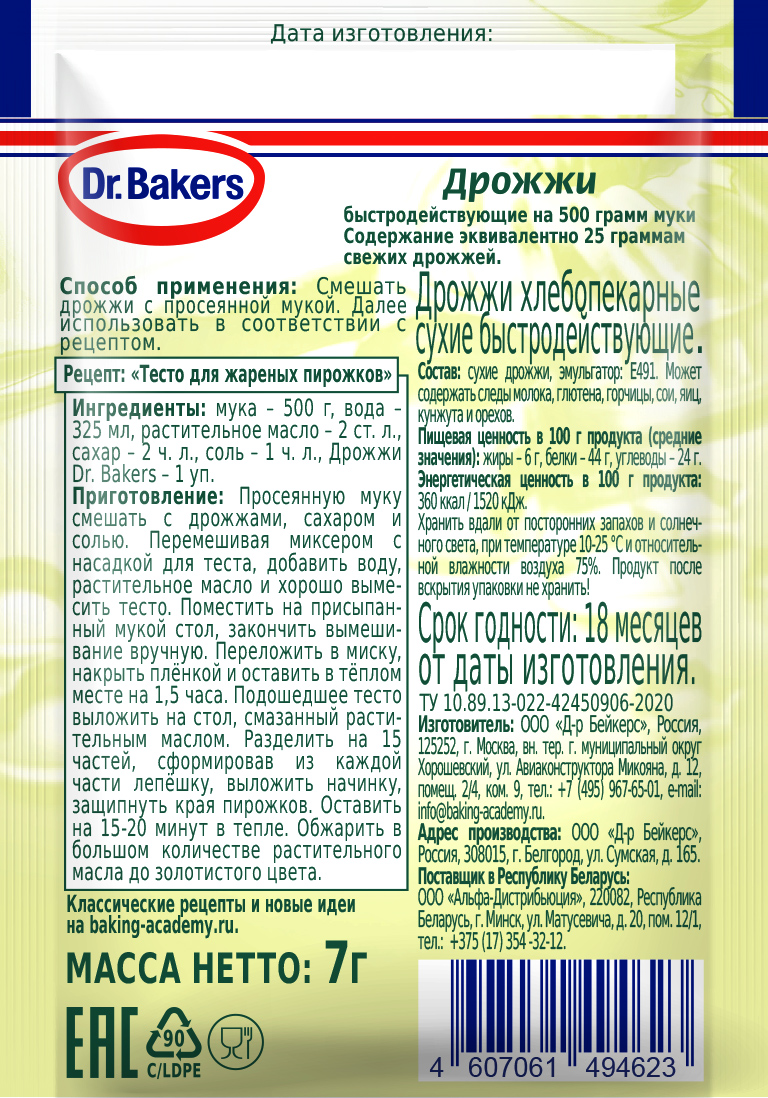 Состав: сухие дрожжи, эмульгатор.Пищевая ценность на 100г продукта: жиры 6г, белки 48г, углеводы 36г.Энергетическая ценность 392ккал.Содержание эквивалентно 25г свежих дрожжейХранить в сухом прохладном месте.Срок годности: 18 месяцев