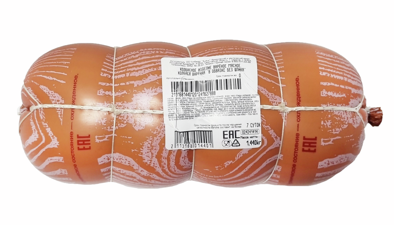 Колбаса Дубки в обвязке без шпика вареная, ~1.5 кг идеально сочетается с сыром, хлебом, маринованными огурцами, свежими овощами и зеленью. С такой колбасой получаются аппетитные салаты, закуски, бутерброды, сэндвичи и многое другое. В нарезанном виде она может стать настоящим украшением как повседневного, так и праздничного стола. Ее можно жарить на сковороде, запекать в духовом шкафу или добавлять к яичнице, омлету, в супы, рагу. Вкусное мясное изделие готовится по классической технологии из отборного мяса высокого качества с добавлением небольшого количества разных специй. Продукт отличается плотной текстурой, насыщенным вкусом с легкой молочной ноткой и приятным ароматом, который может понравиться всем членам семьи. Мясное изделие сохраняет свою форму и может стать отличным вариантом завтрака, дополнением к обеду или ужину. Благодаря умеренной калорийности продукт быстро утолит чувство голода и насытит. В умеренном количестве мясной деликатес не навредит фигуре.