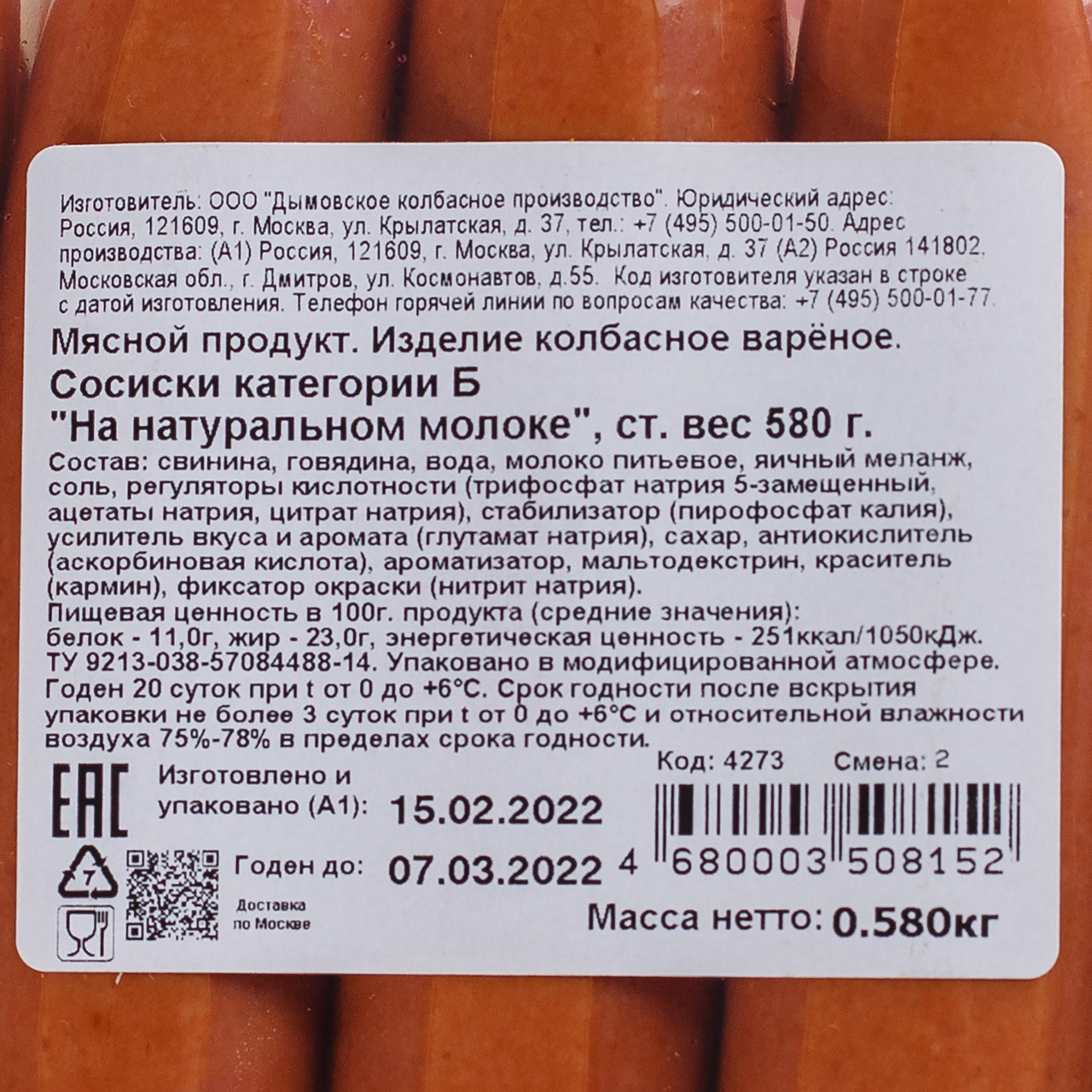 Сосиски Дымов с натуральным молоком сделают ваш обед сытным и вкусным. Мясной продукт изготовлен из отличного российского мяса и настоящего коровьего молока, в соответствии с современными технологиями и без содержания ГМО. Мясная продукция категории А охлажденная становится еще вкуснее и сочнее благодаря защитной вакуумной упаковке, которая сберегает все ее полезные свойства вместе с превосходным вкусом. Очень удобные в приготовлении сосиски подходят для отваривания, приготовления как в микроволной печи, так и на открытом огне, даже на пикнике. Приобрести Сосиски ДЫМОВ с натуральным молоком, 570г по привлекательной цене можно в торговом центре METRO.Состав: свинина, говядина, вода, молоко питьевое, яичный меланж, сольповаренная пищевая, стабилизаторы (фосфаты пищевые), усилитель вкуса иаромата (глутамат натрия), сахар, антиокислитель (аскорбиновая кислота),натуральный пищевой краситель (кармин), фиксатор окраски (нитритнатрия).Пищевая ценность 100г продукта: белок - не менее 11,0г, жир – не более23,0г.Энергетическая ценность: не более 251ккал/1054 кДж.