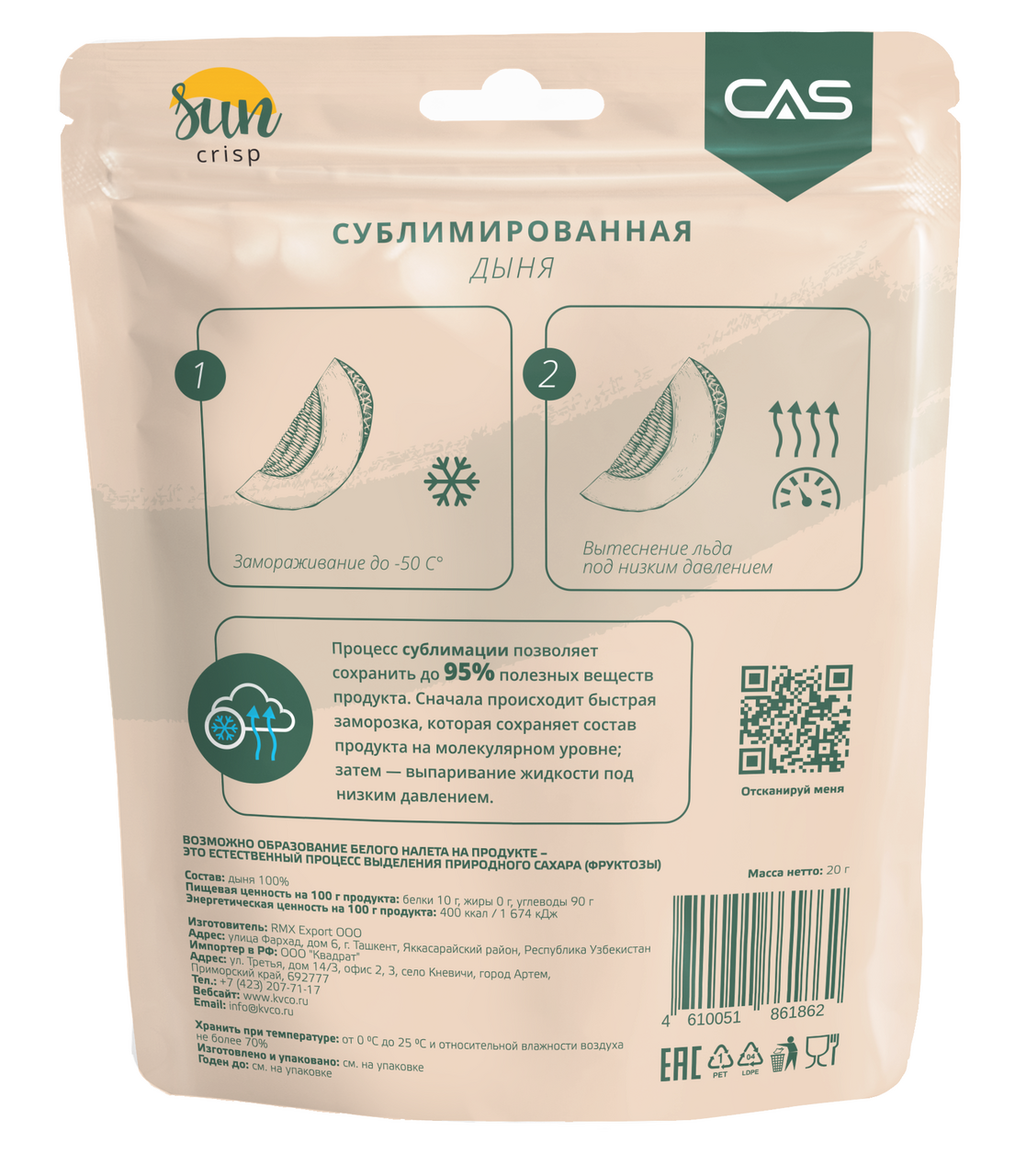 Сублимированная дыня - это очень полезный и вкусный перекус. Это 100% натуральный продукт без сахара, красителей и добавок. Дыня сублимированная - это насыщенный вкус сладкой и ароматной дыни в любое время года. Современная технология позволяет сохранить все питательные вещества, витамины, вкус и запах. При этом не используются абсолютно никакие добавки, как химического, так и натурального происхождения, в том числе и сахар. Сублимация - это процесс, при котором ягоды обезвоживаются вакуумным способом. При этом они сохраняют свою форму, естественный цвет, вкус и аромат, а также витамины и микроэлементы. Содержит максимальное количество витаминов, это вкусный, удобный и полезный перекус. Процесс сублимации позволяет сохранить до 95% полезных веществ фруктов. Сначала происходит быстрая заморозка, которая сохраняет состав продукта на молекулярном уровне; затем выпаривание жидкости под низким давлением.