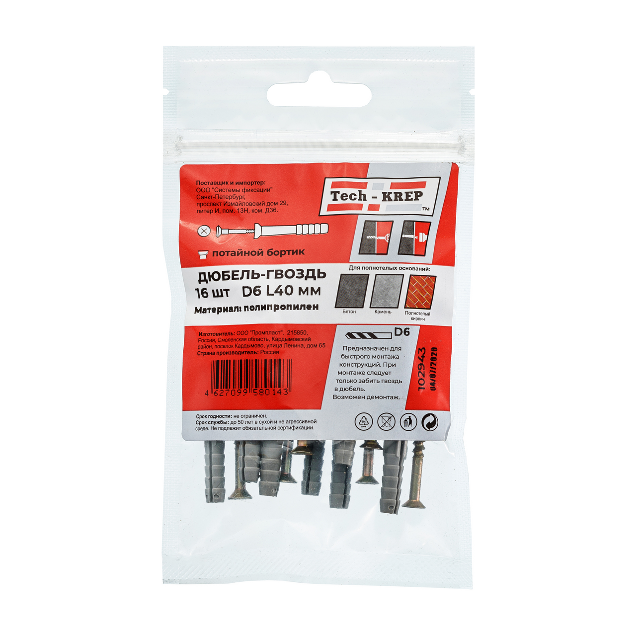 Дюбель-гвоздь потайной TECH-KREP 6х40, 16шт
