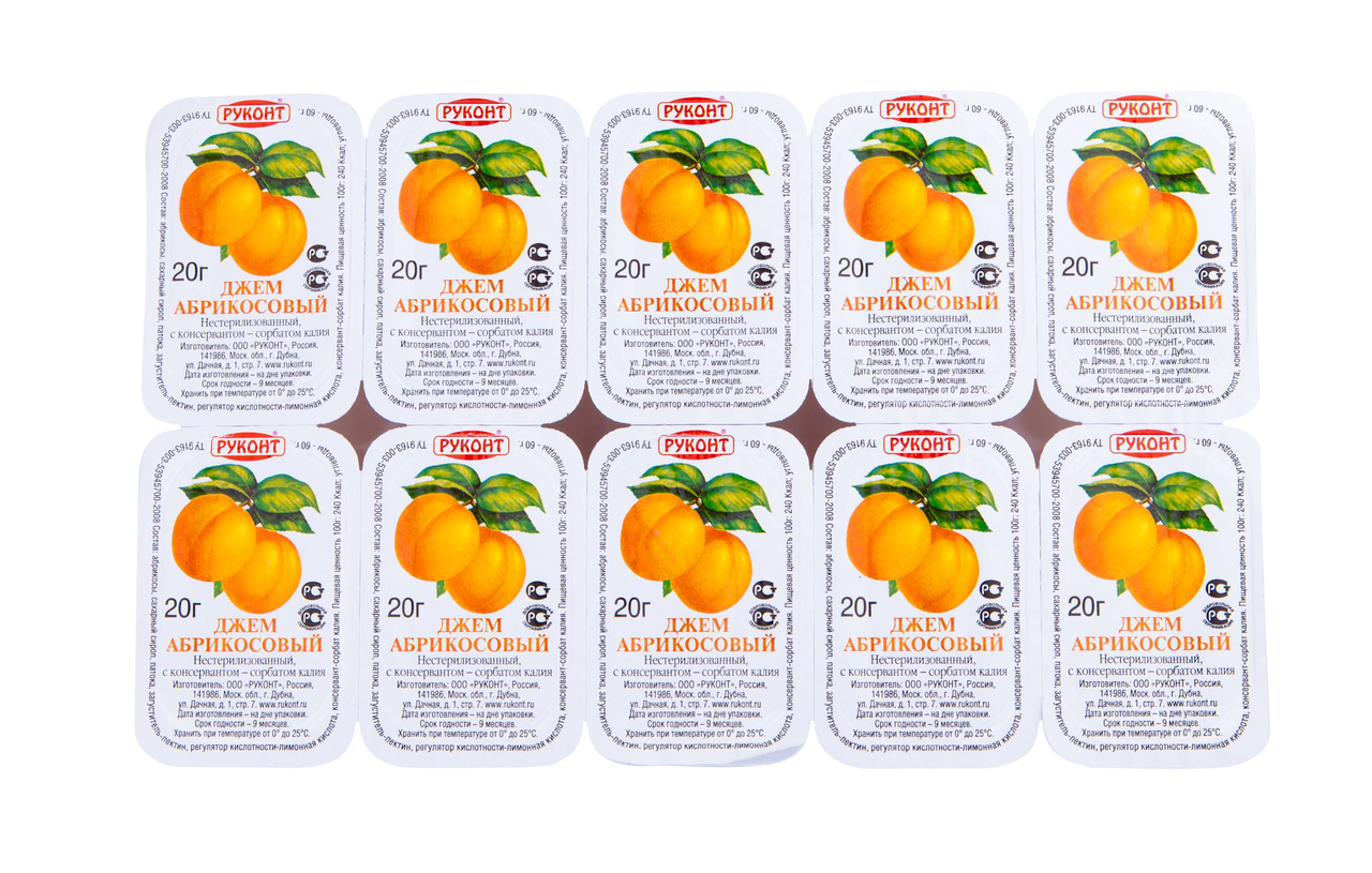 Джем абрикосовый, 20 х 20г. Нестерилизованный, с консервантом-сорбатом калия. Состав: абрикосы, сахарный сироп, патока, загуститель- пектин, регулятор кислотности- лимонная кислота, консевант- сорбат калия. Хранить при температуре от 0 до +25. Энергетическая ценность: 240ккал на 100г продукта.