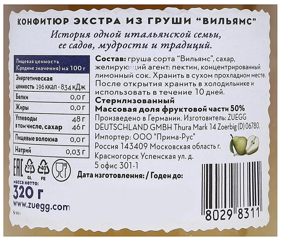 Джем Zuegg Груша Вильямс конфитюр экстра, 320г
