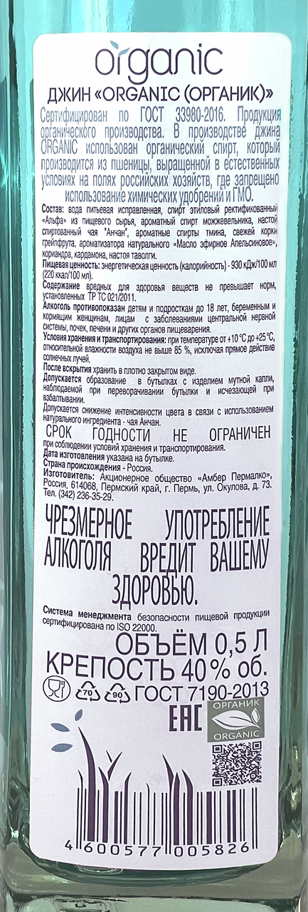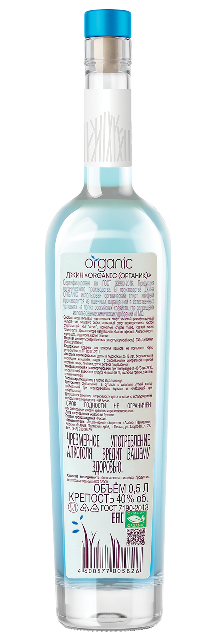 Джин Organic - органический продукт. В его основе природная вода и органический спирт Альфа. Зерно для такого спирта выращивают на сертифицированных площадях с применением исключительно органических удобрений и бережным возделыванием почвы. Аромат напитка - можжевеловый, с травяными нотами. Вкус - мягкий, гармоничный, с преобладанием можжевельника. Нежно-голубой цвет достигается за счёт добавления настоя чая Анчан из цветков тропического растения Clitoria ternatea. Напиток сертифицирован как органический продукт на соответствие ГОСТ 33980-2016. Сертификат зарегистрирован в Едином государственном реестре производителей органической продукции.
