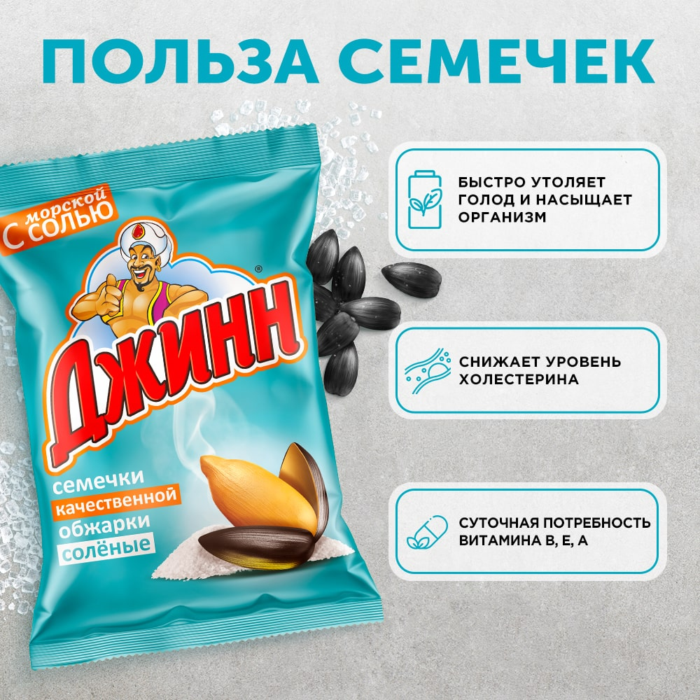 Семечки Джинн качественной обжарки с морской солью, 250 г станут отличным перекусом во время просмотра футбольного матча или любимого сериала. Они отличаются в меру соленым вкусом и приятным ароматом подсолнечника. Для их производства используются семена, выращенные на полях Краснодарского края, Адыгеи и Алтая. В упаковку попадают самые крупные семечки, без дефектов. Их сушат по специальной технологии, поэтому они сохраняют свои вкусовые свойства и легко отделяют от кожуры. Семечки подсолнечника богаты витаминами В, Е, аминокислотами и другими полезными веществами. Их употребление положительно воздействует на состояние волос, ногтей и кожи. Они укрепляют стенки сосудов, нормализуют работу желудочно-кишечного тракта, помогают бороться со стрессами. Сегодня компания Смарт является одним из федеральных лидеров рынка семян подсолнечника и арахиса в России, странах СНГ, Европы и Азии. Продукция Смарт прочно ассоциируется у покупателей с качеством и инновациями. Собственные сельскохозяйственные комплексы компании Смарт позволяют гарантировать высокое качество сырья, а сертифицированные лаборатории, оснащенные современным оборудованием – контролировать соответствие продукции, предъявляемым требованиям. Но продукция компании Смарт не только качественная, но и полезная для здоровья.