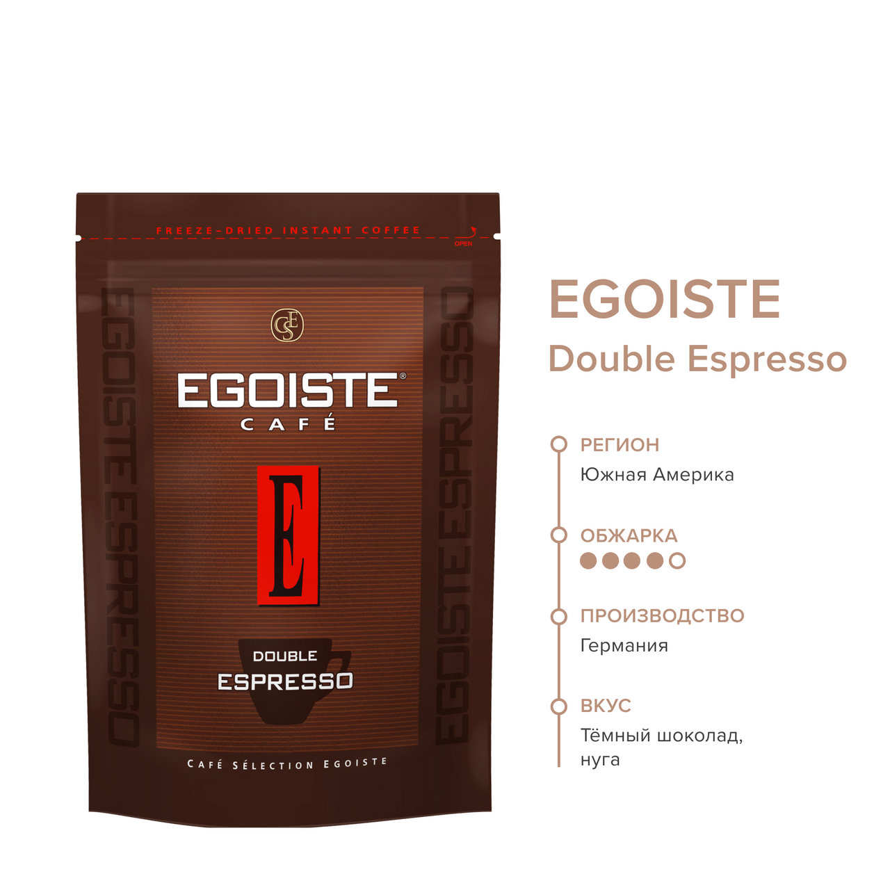 EGOISTE Double Espresso 70 г - растворимый сублимированный кофе из 100% премиальной арабики.За насыщенность бленда из Южной Америки отвечает тёмный шоколад в основе, за вкусовой баланс - сладкие ноты нуги, не дающие кофе ни одного шанса проявить излишнюю кислотность в послевкусии.EGOISTE - кофе для тех, кому трудно угодить.