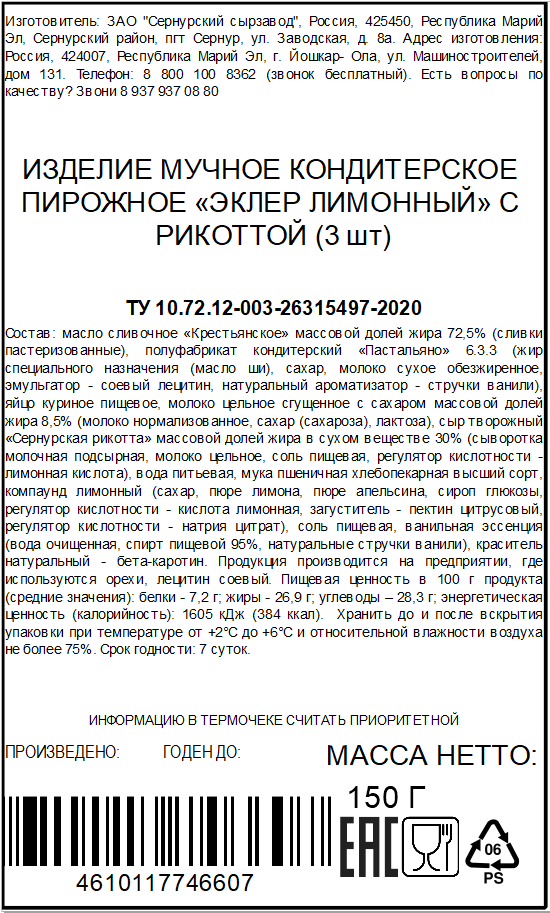 Масло сливочное Крестьянское массовой долей жира 72,5% (сливки пастеризованные), полуфабрикат кондитерский Пастальяно 6.33 (жир специального назначения (масло ши), сахар, молоко сухое обезжиренное, эмульгатор - соевый лецитин, натуральный ароматизатор - стручки ванили), яйцо куриное пищевое, молоко цельное сгущенное с сахаром массовой долей жира 8,5% (молоко нормализованное, сахар (сахароза), лактоза), сыр творожный Сернурская рикотта массовой долей жира в сухом веществе 30% (сыворотка молочная подсырная, молоко цельное, соль пищевая, регулятор кислотности - лимонная кислота), вода питьевая, мука пшеничная хлебопекарная высший сорт, компаунд лимонный (сахар пюре лимона пюре апельсина, сироп глюкозы, регулятор кислотности - кислота лимонная, загуститель - пектин цитрусовый регулятор кислотности - натрия цитрат), соль пищевая, ванильная эссенция (вода очищенная, спирт пищевой 95%, натуральные стручки ванили), краситель натуральный - бета-каротин.