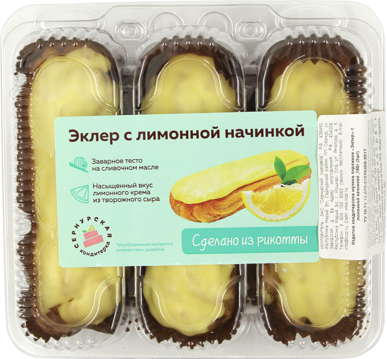 Пирожное со сливочно-лимонным кремом из Сернурской рикотты, покрытое мягкой глазурью с добавлением лимонной цедры, придется по вкусу любителям новых гастрономических ощущений. Наши технологи таким образом подобрали все ингредиенты, что молочный вкус твороженного сыра прекрасно гармонирует с нотками лимона и придает десерту летнюю свежесть. А пышное заварное тесто позволяет как можно больше наполнить эклер ароматным кремом, отличным от знакомого с детства ванильного и шоколадного. Это нежное заварное тесто, наполненное творожно-сливочной начинкой из классической рикотты.