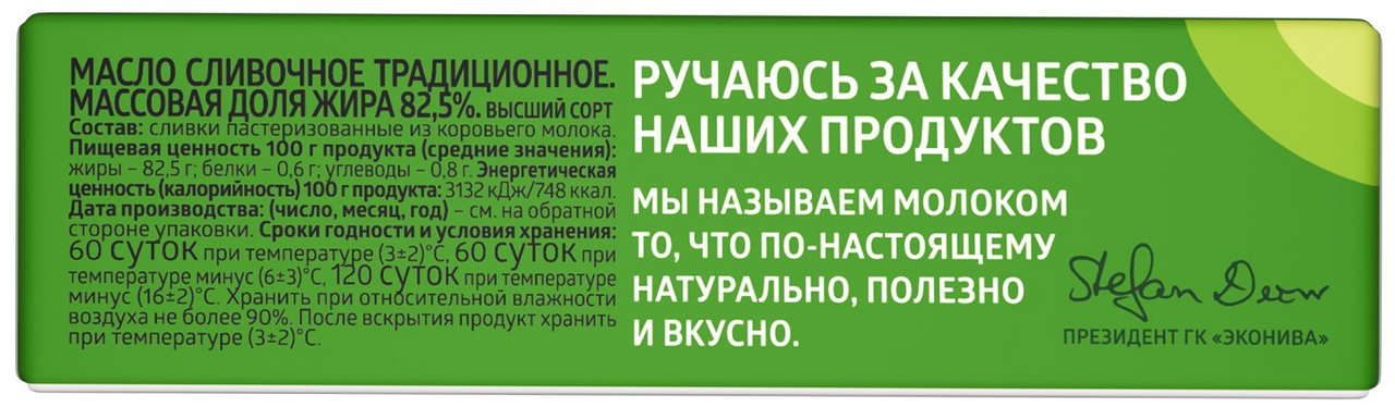 Сливочное масло ЭкоНива традиционное 82,5 % получают из натуральных высокожирных сливок методом сбивания или преобразования. Важно отметить, что масло ЭкоНива обладает ярко выраженным сливочным вкусом и придаёт изысканную нежность любимым блюдам, будь то каши и картофельное пюре или торты и печенья.Как придать необычные вкус и аромат маслу? — Смешайте его с мелко нарезанными чесноком и зеленью, а затем намажьте на свежеиспечённый хлеб. Пикантная закуска готова!