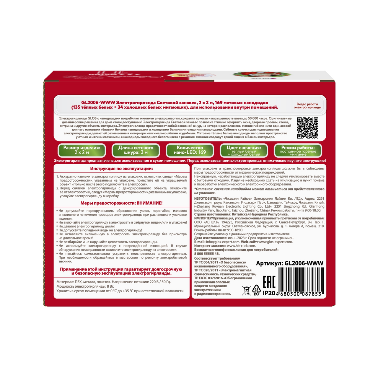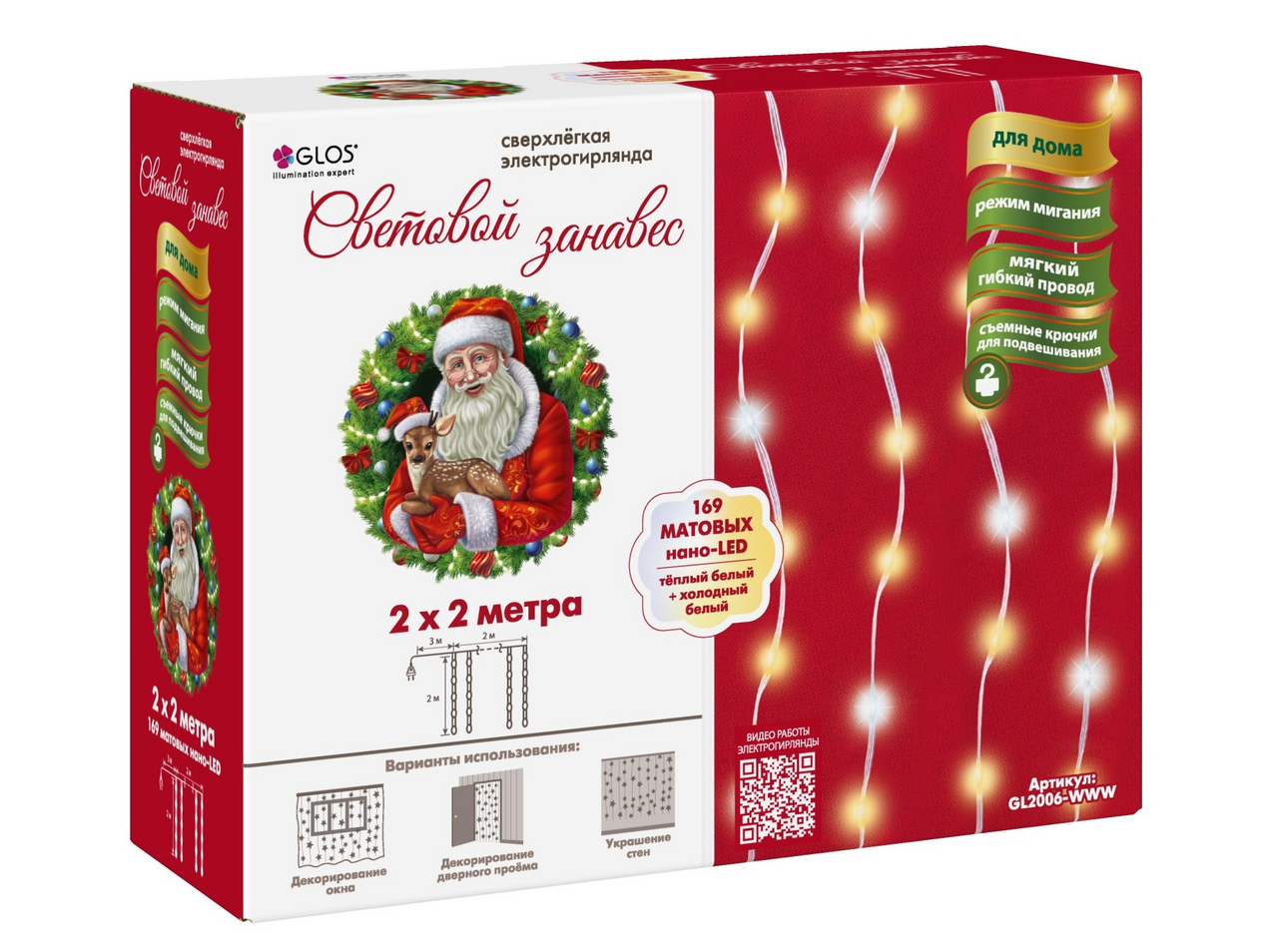 Электрогирлянда занавес Glos Световой 169 нано-Led теплый белый и холодный белый, 2 x 2м