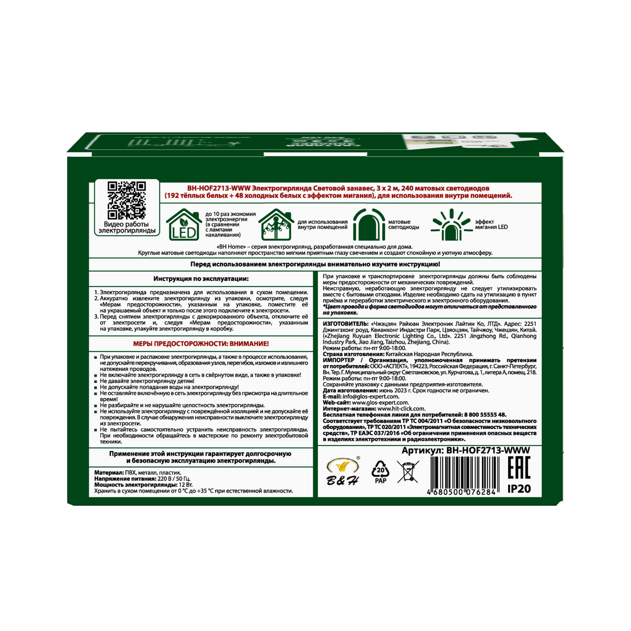 Электрогирлянда занавес B&H Световой 240Led теплый белый и холодный белый, 3 x 2м