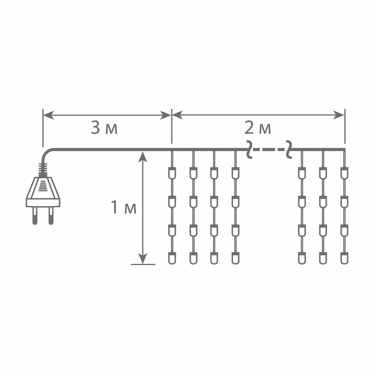 Прозрачный ПВХ провод, в длину гирлянда 2 метра, свисающие нити длинной 1 метр на которых расположены равномерно через 10см. 80 светодиодов теплый белый цвет свечения, изделие без динамики, гирлянда готовое изделие и может работать самостоятельно, контроллер не требуется, есть возможность соединить гирлянду с другой такой же по конструкции гирляндой, количество соединений до 6 штук в одну линию от одного сетевого шнура