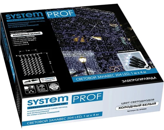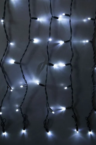Электрогирлянда Световой Занавес, 204 холодных белых LED, 1 м х 4м. Для использования снаружи и внутри помещений. Это гибкий прозрачный провод с расположенными на нем нитями одинаковой длины и многочисленными светодиодами различного цвета. Гирлянда имеет несколько режимов яркости и вариантов свечения. С ее помощью создается уютная обстановка в помещении и праздничное настроение. Модель характеризуется износоустойчивостью и долговечностью. С ее помощью можно декорировать окно, новогоднюю елку, стены, дверные проемы. Также изделие легко можно прикрепить к потолку и создать импровизированную штору.