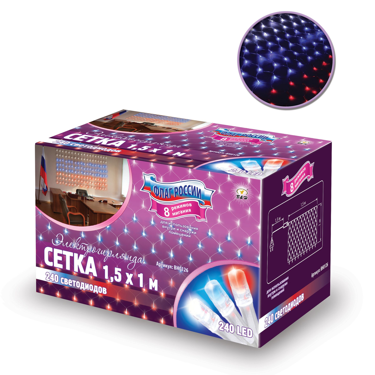 Электрогирлянда сетка B&H Флаг России 240Led мультиколор, 1.5 х 1м