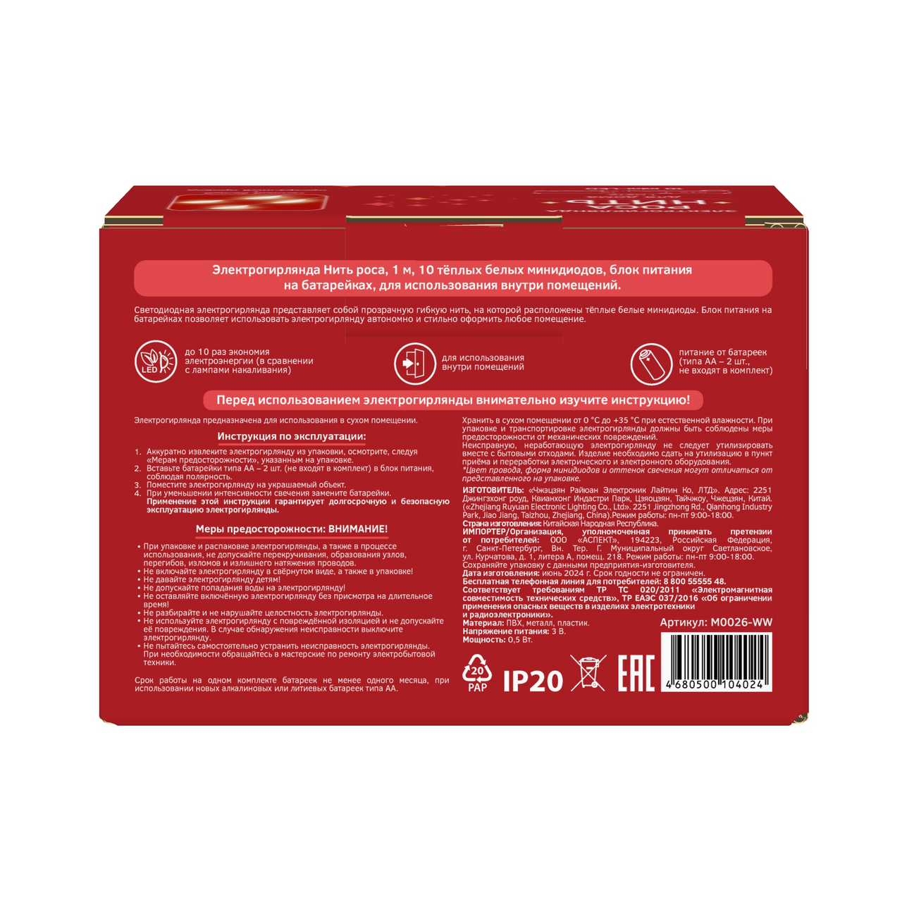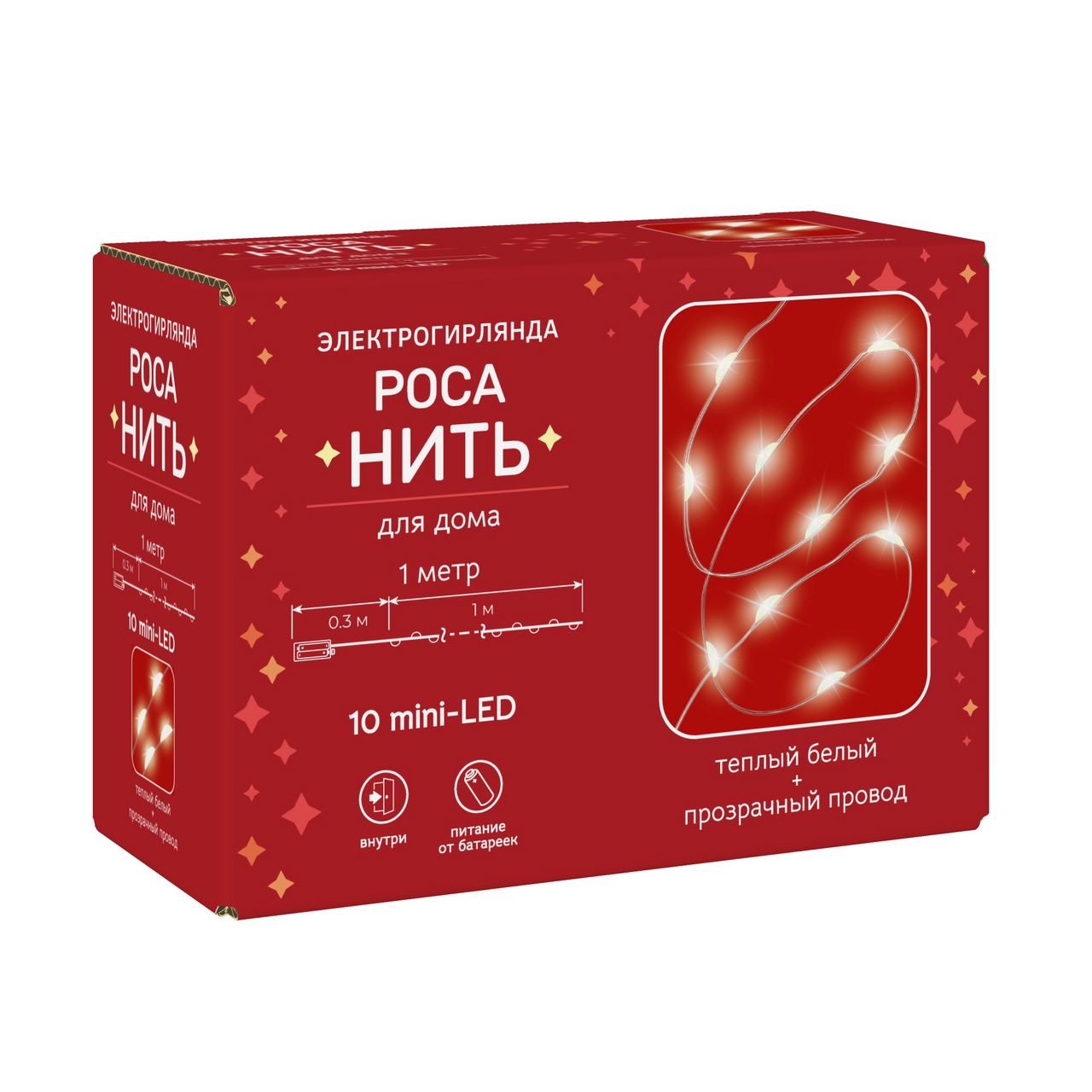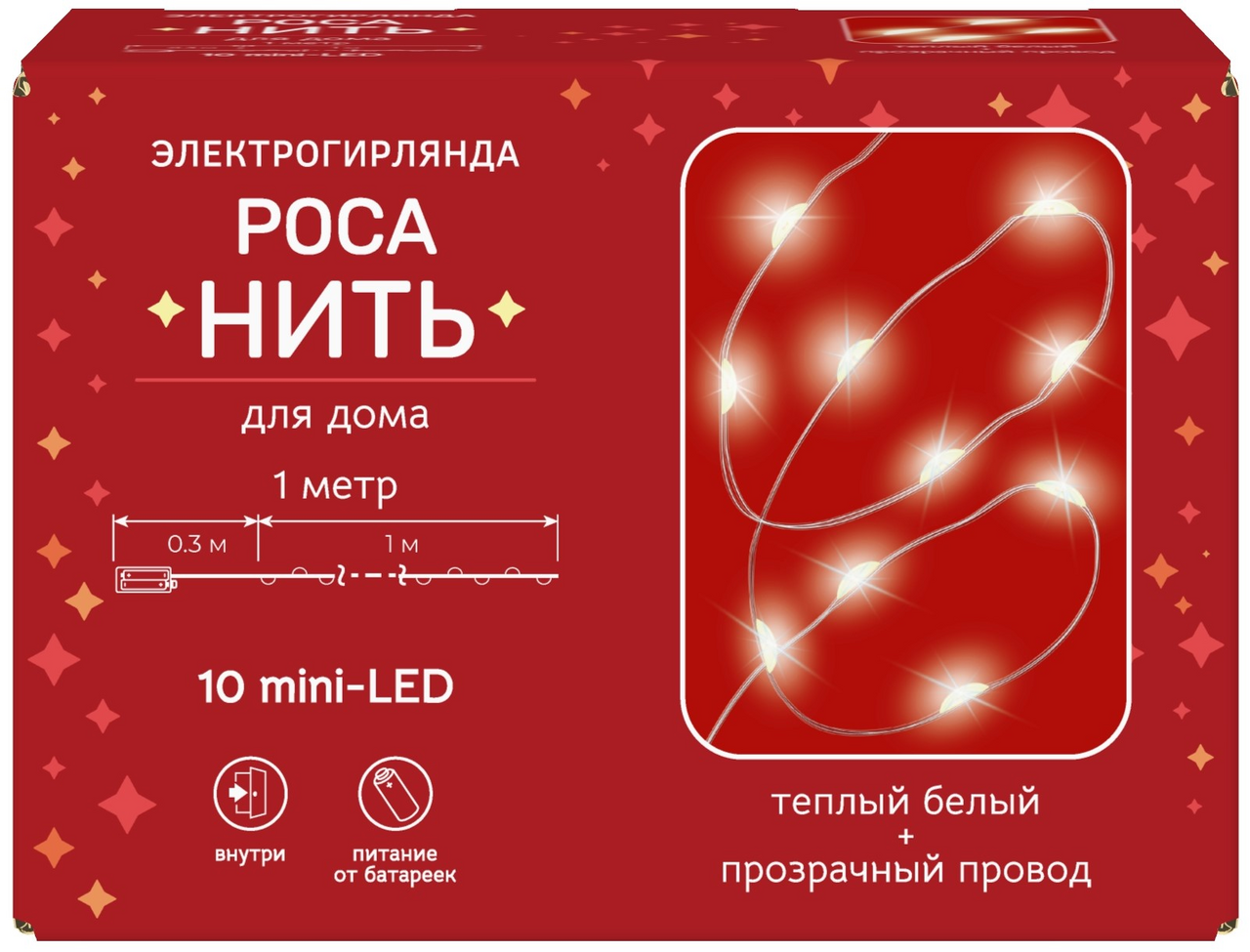 Электрогирлянда нить Роса 10 mini-Led теплый белый, 1м
