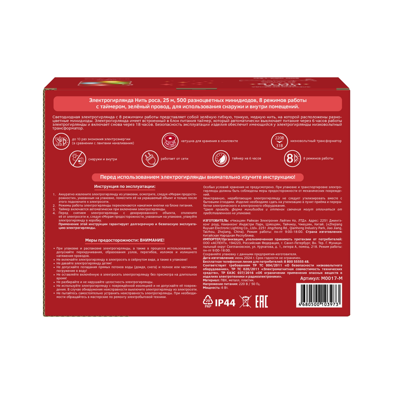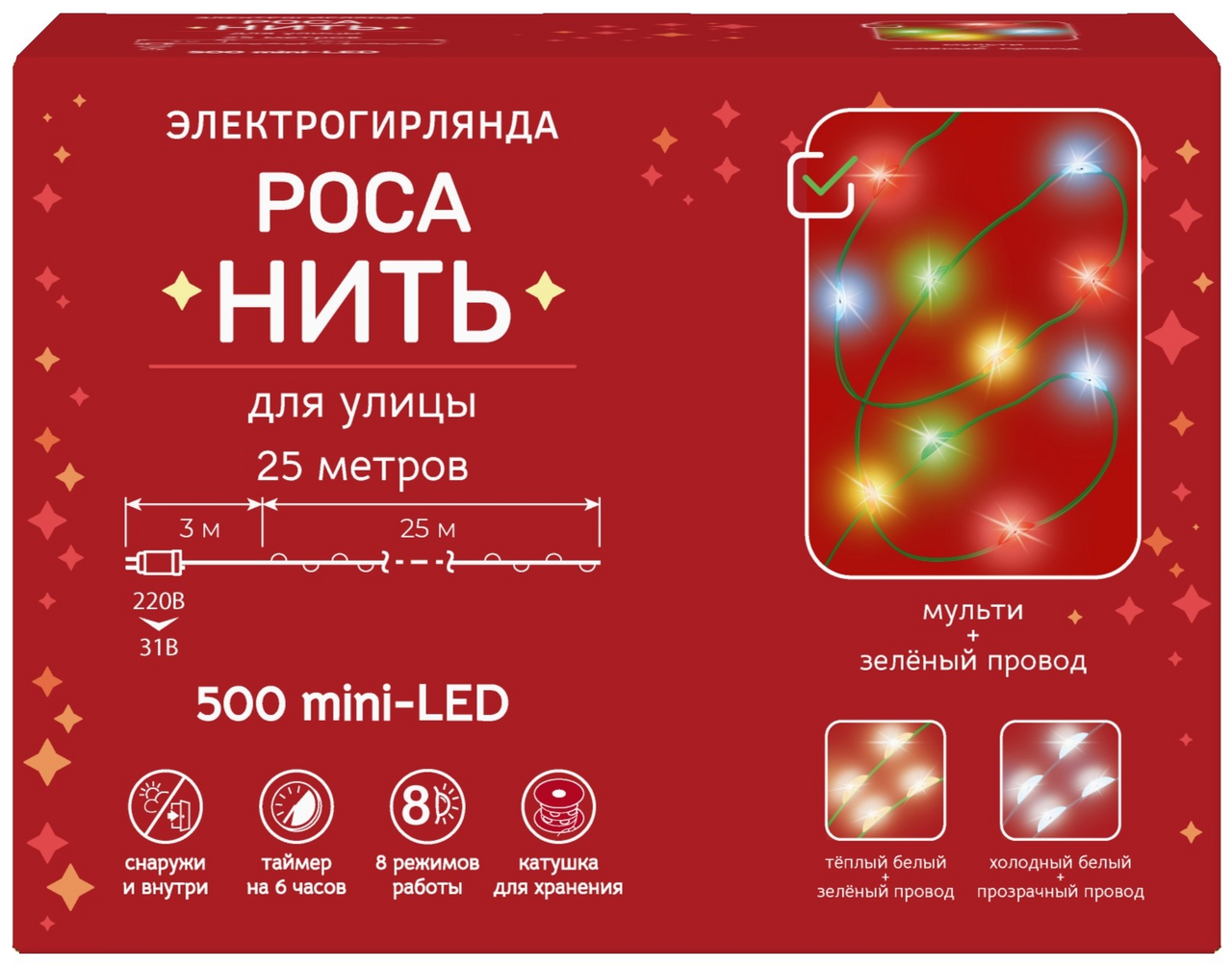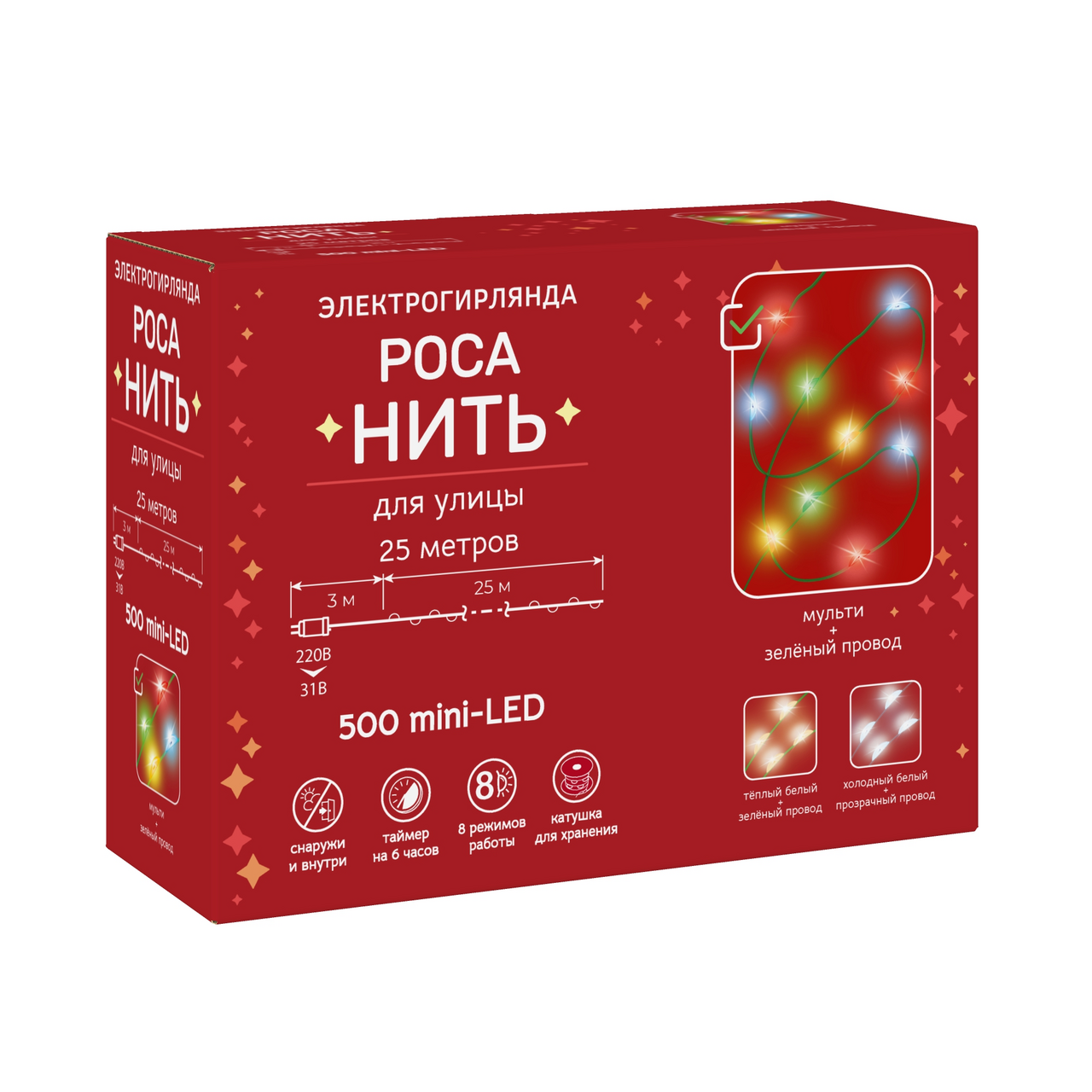 Электрогирлянда нить Роса 500 mini-Led мультиколор, 25м