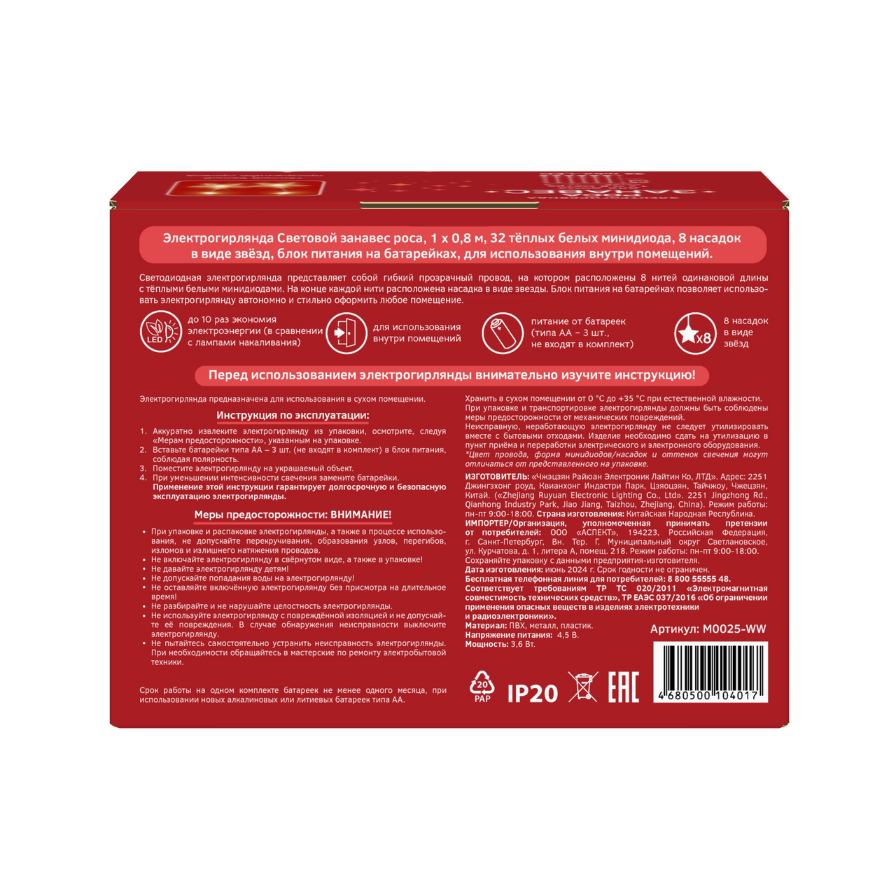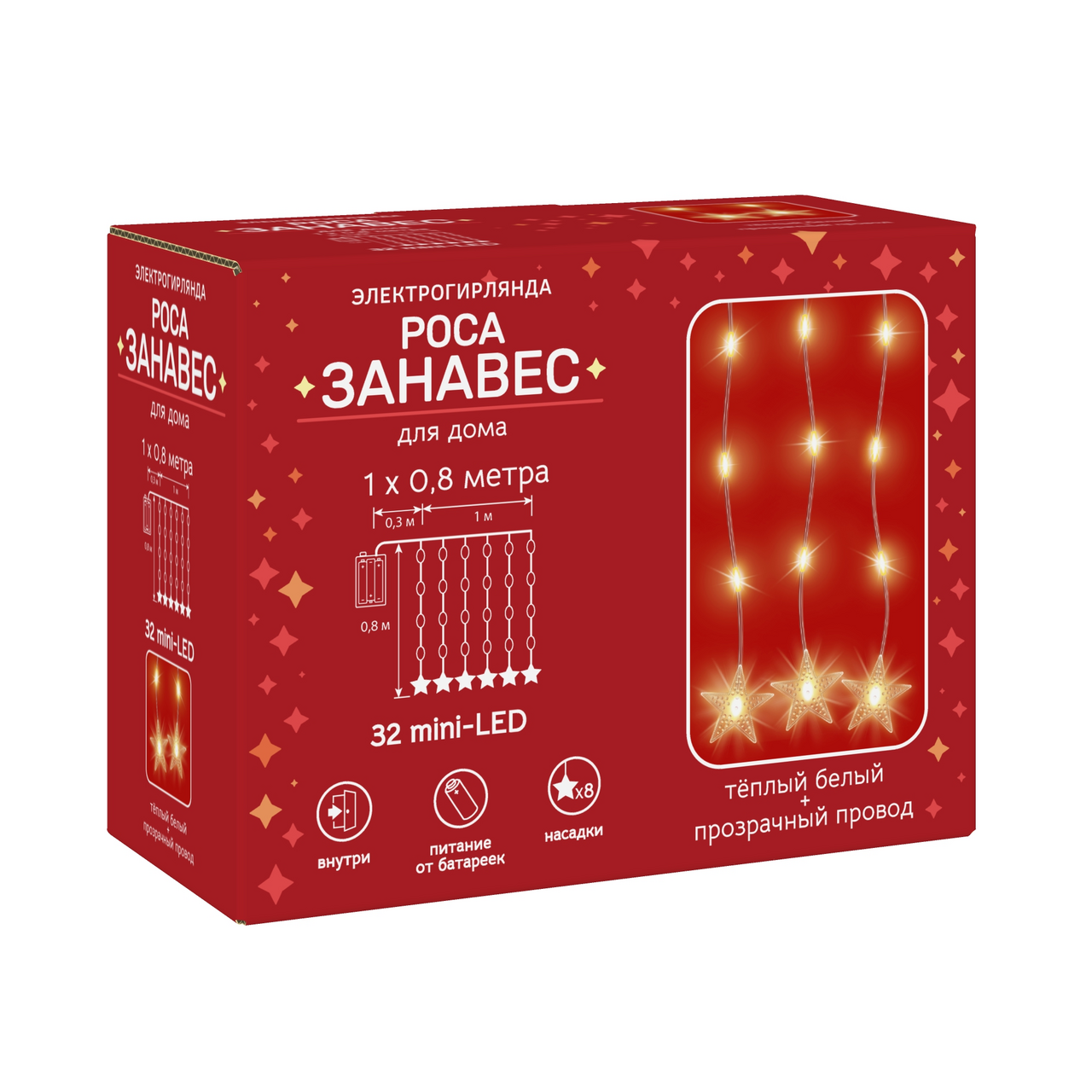 Электрогирлянда Световой занавес из 32 тёплых белых светодиода, 8 насадок в виде звёзд, блок питания на батарейках, для использования внутри помещений. Батарейки в комплект не входят. Занавес отлично подойдет для украшения окон. Это световой декор, который представляет собой набор вертикально расположенных нитей со светодиодными лампочками. Такие гирлянды создают эффект переливающихся световых завес, которые используются для украшения окон, стен, полок и других поверхностей. Также такой вид декора часто используется на праздниках, свадьбах и других мероприятиях для создания атмосферного освещения. Его закрепляют на стенах, проемах, дверях или даже используют для создания арки или декоративной стены. Гирлянда занавес является универсальным декоративным элементом, который придаст праздничности и стиля.