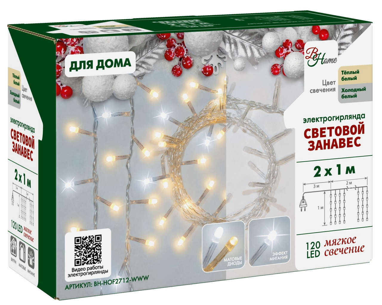 Электрогирлянда занавес B&H 100Led теплый белый и 20Led холодный белый, 2 x 1м
