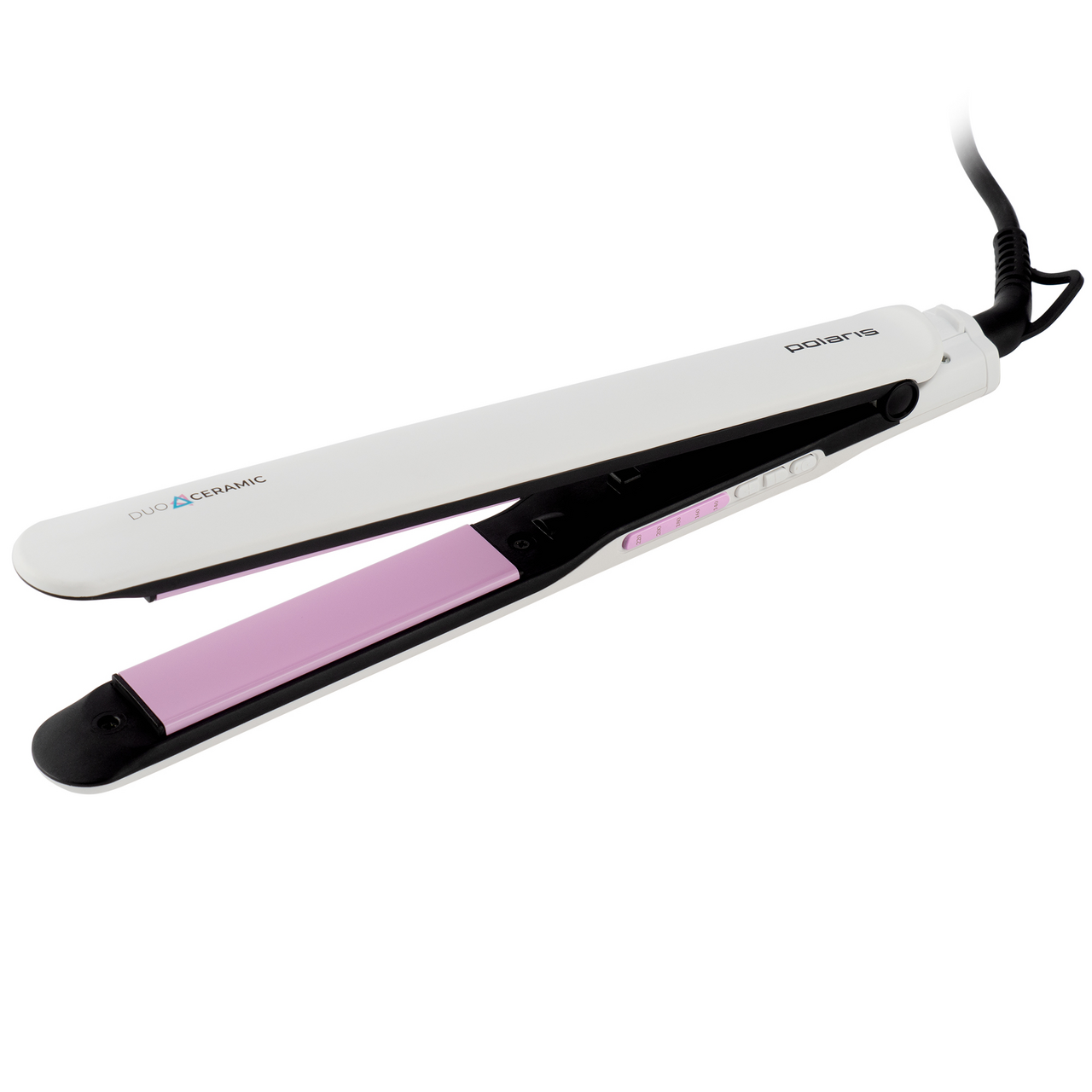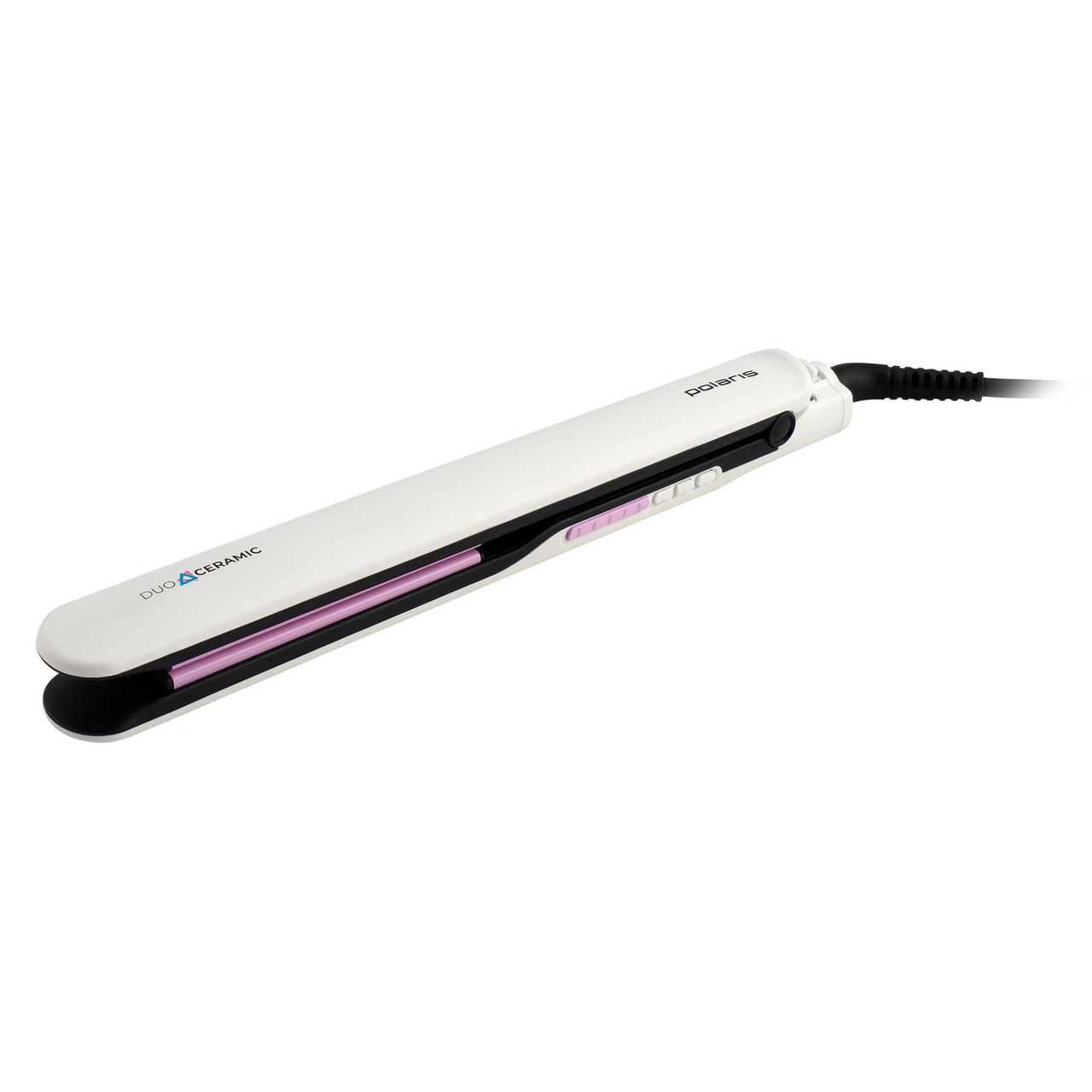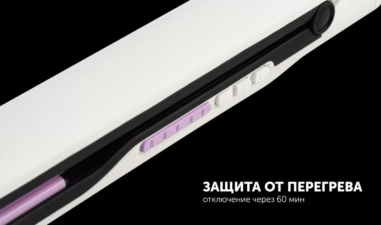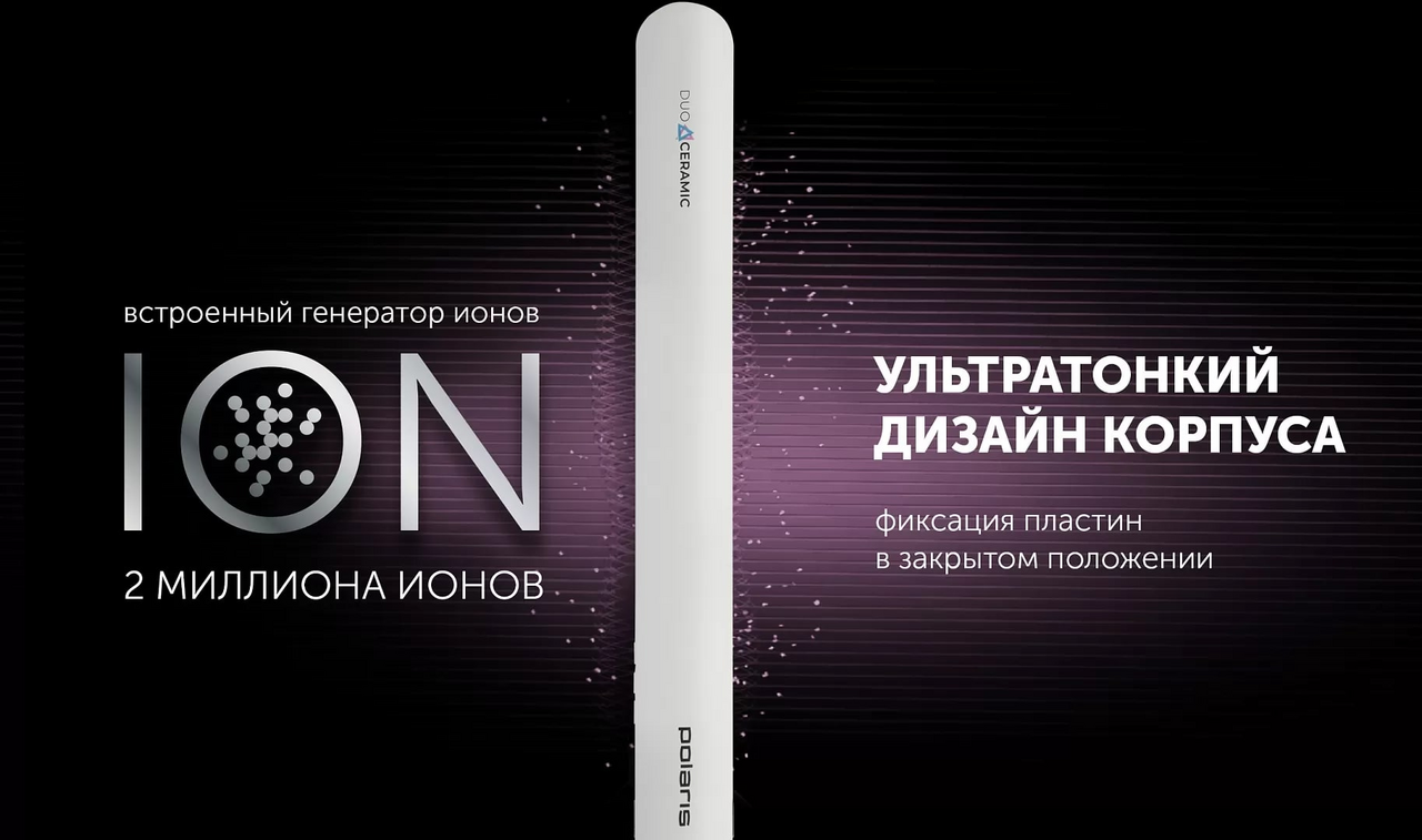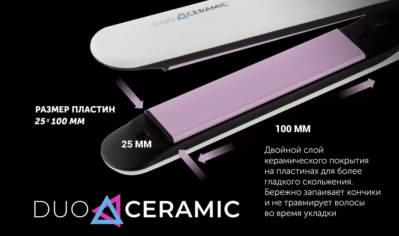 Ультратонкий дизайн корпуса. Технология покрытия пластин DuoCeramic защищает и сохраняет здоровый вид волос, обеспечивает легкое скольжение за счет керамического покрытия с двумя дополнительными слоями. Первый слой – для прочности и долговечности покрытия. Второй - для легкого скольжения и деликатного равномерного нагрева. Фиксация корпуса в закрытом положении. Шарнирное вращение шнура на 360С. Петелька для подвешивания. Защита от перегрева. Автоотключение через 60 минут.