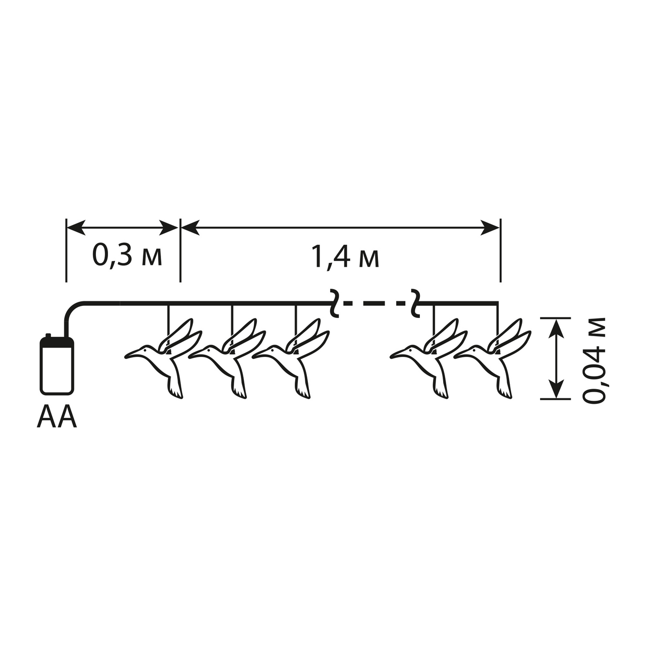 Электрогирлянда представляет собой гибкий прозрачный провод, на котором расположены светодиоды холодного белого цвета с насадками в виде прозрачных колибри. Электрогирлянда яркая и долговечная.