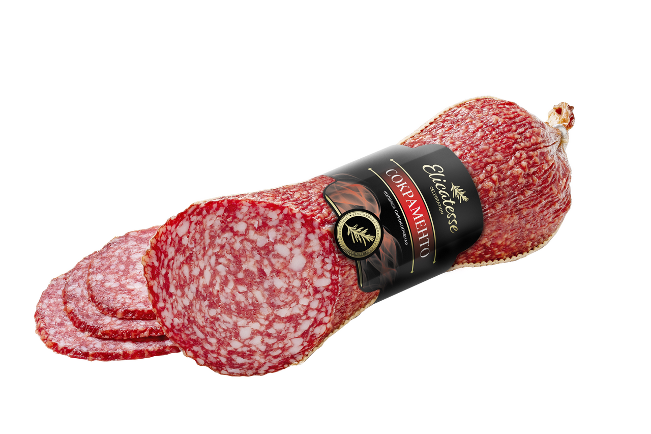 Колбаса Elicatesse Сокраменто сыровяленая, ~700г – высококачественный деликатес, полностью готовый к употреблению. Сочная колбаса с богатым, мясным вкусом и насыщенным ароматом. Приготовлен продукт из мяса с добавлением ароматных специй. Продукт питательный и полезный, так как он усваивается полностью вашим организмом. Насыщая вас правильной энергией, и полезными веществами. Колбаса плотная, имеет красивый срез. Отлично нарезается на тонкие, ровные слайсы. Она займет главное место на праздничном столе в виде нарезки. Из нее получаться вкусные бутерброды с белым хлебом и свежими овощами. Аппетитные канапе с черным хлебом и маринованным огурчиком, вкусная закуска под прохладительные напитки.