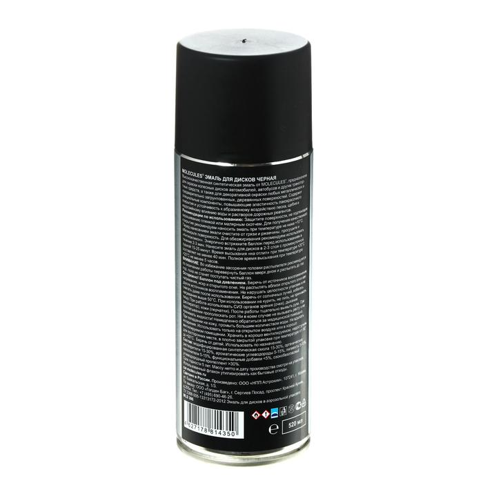 Эмаль для дисков Molecules черная, 520мл предназначенное для окраски колесных дисков автомобилей, автобусов и других транспортных средств, а также для декоративной окраски любых металлических и предварительно загрунтованных, деревянных поверхностей.