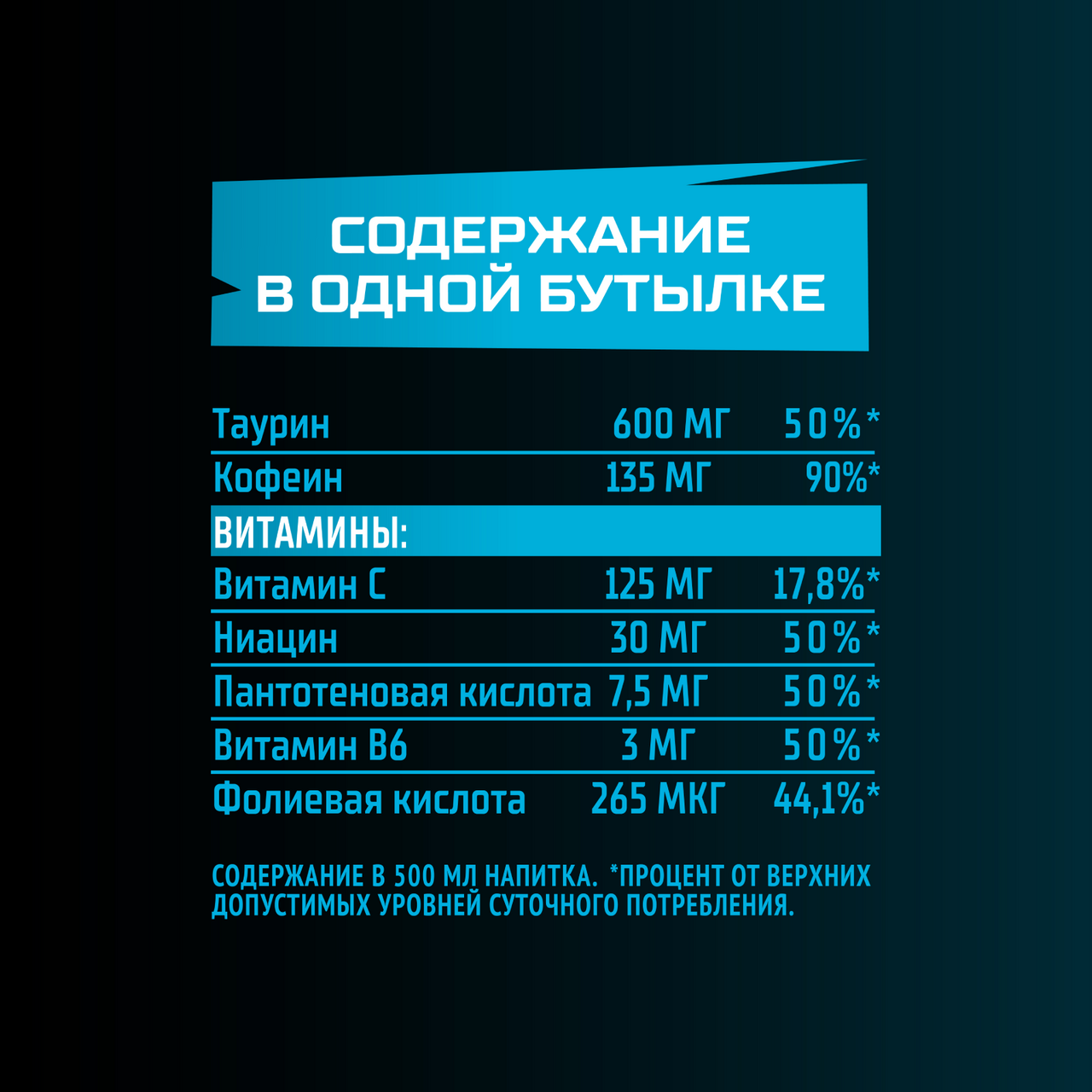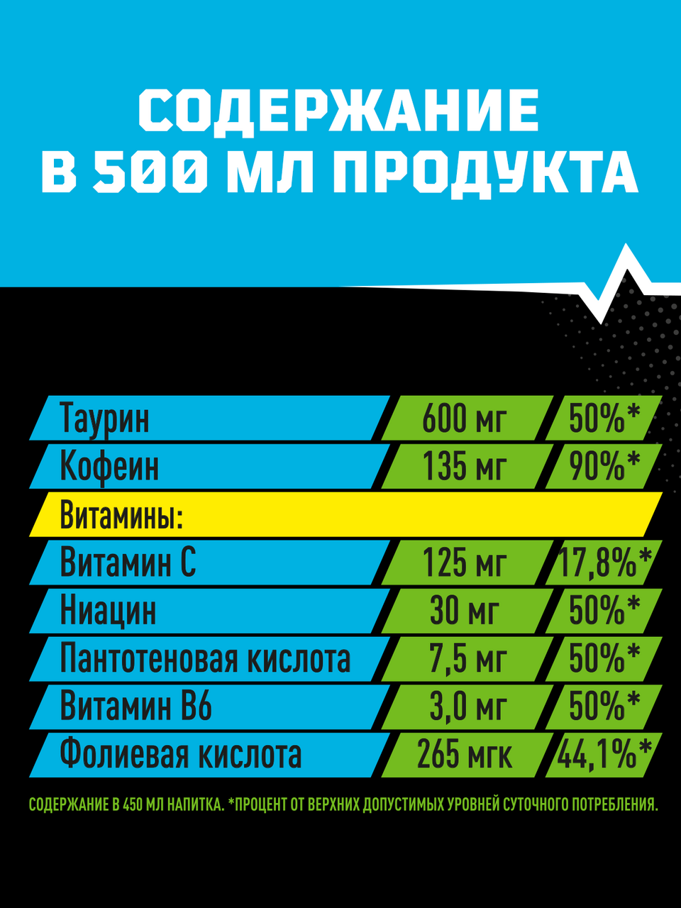 Вода питьевая очищенная, сахар, вкусо-ароматическая основа Энергия (таурин, ароматизатор, антиокислитель аскорбиновая кислота, кофеин, краситель Е150d, ниацин, пантотеновая кислота, витамин В6, красители: рибофлавин и жёлтый хинолиновый, фолиевая кислота), регулятор кислотности кислота лимонная, консерванты: сорбат калия и бензоат натрия.