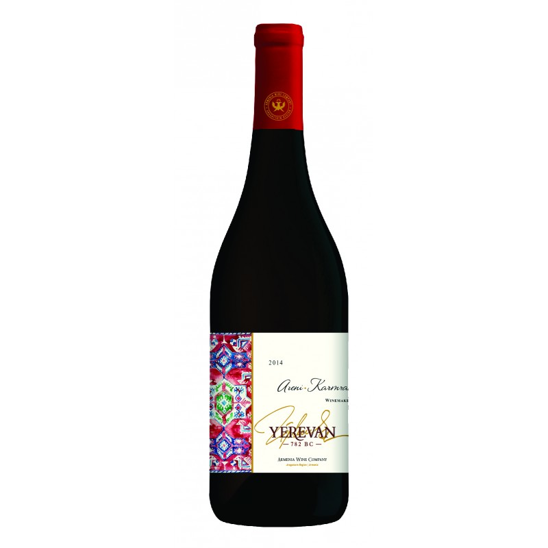 Вино YEREVAN 782 ВС Арени Кармрают красное сухое привлекает сочным, сбалансированным вкусом с продолжительным послевкусием. Аромат благоухает оттенками темной вишни с выраженными тонами специй, сухофруктов и нюансами орехов. Вино, созданное из купажа винограда сортов арени и кармрают, отлично сочетается с мясом, птицей и сырами.