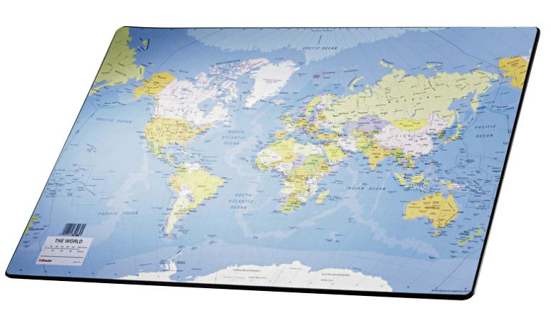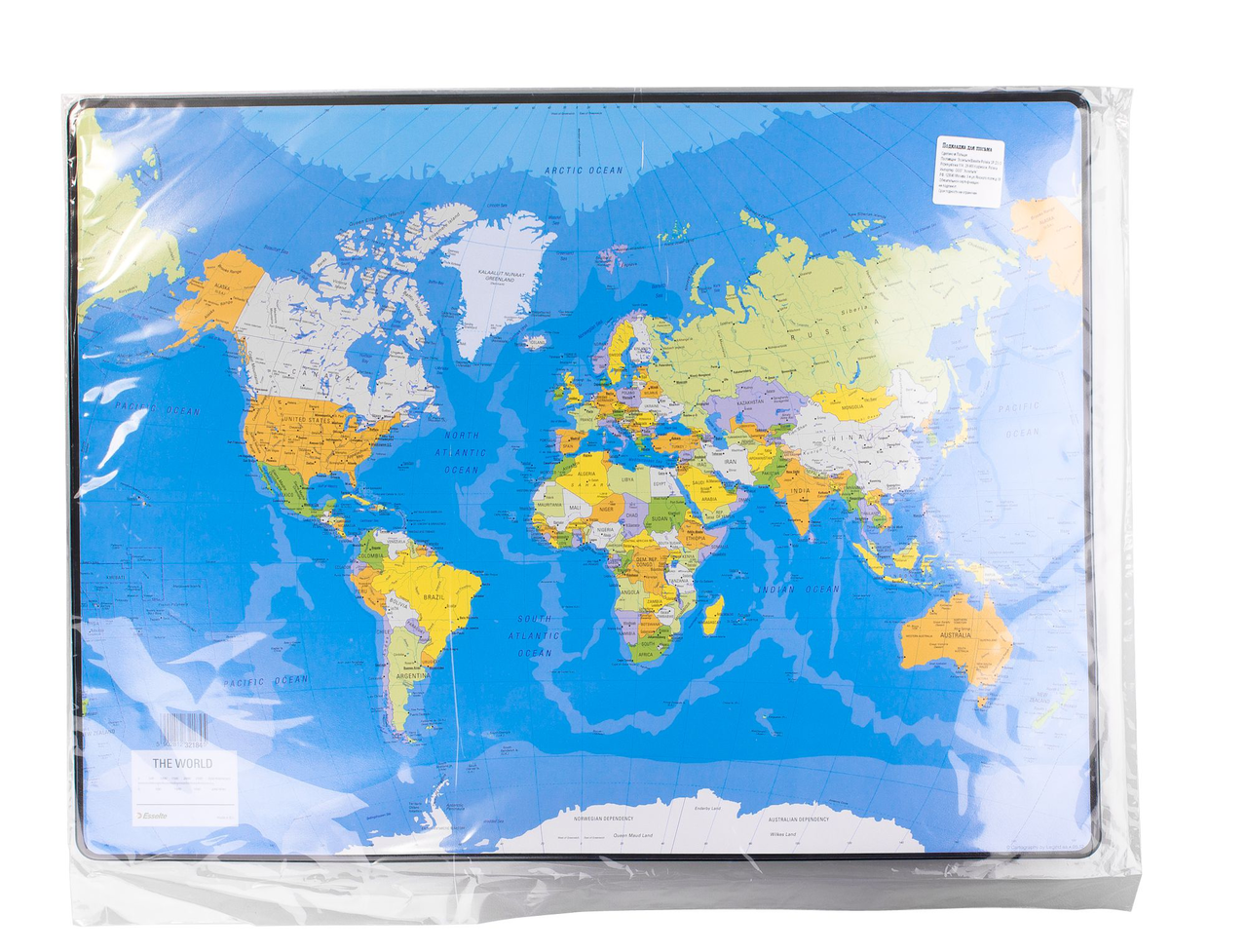 Мат настольный с изображением карты мира. Совмещает в себе коврик для мыши и настольную подкладку. Используется как покрытие на стол, для более мягкого и удобного письма. Придает любому столу более профессиональный вид. На подкладке изображена карта мира. Покрытие идеально для школы и офиса. Снабжено антискользящей нижней поверхностью. Уголки закруглены и запаяны. Размер: 54 x 41 см. Изготовлен из ПВХ. Толщина: 1 мм.