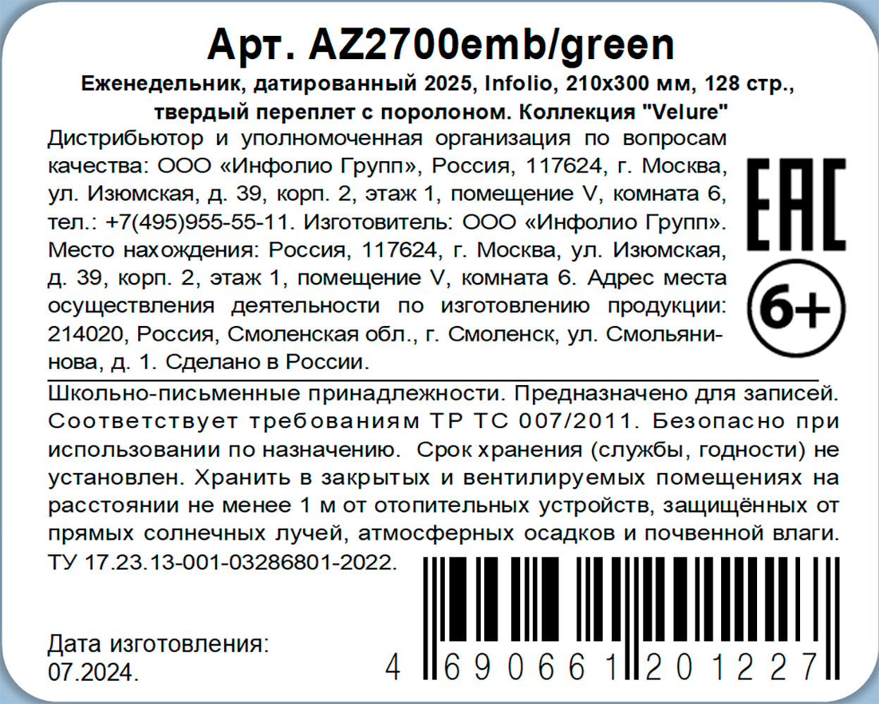 Еженедельник датированный Infolio Velure формата А4 64 листа, зеленый