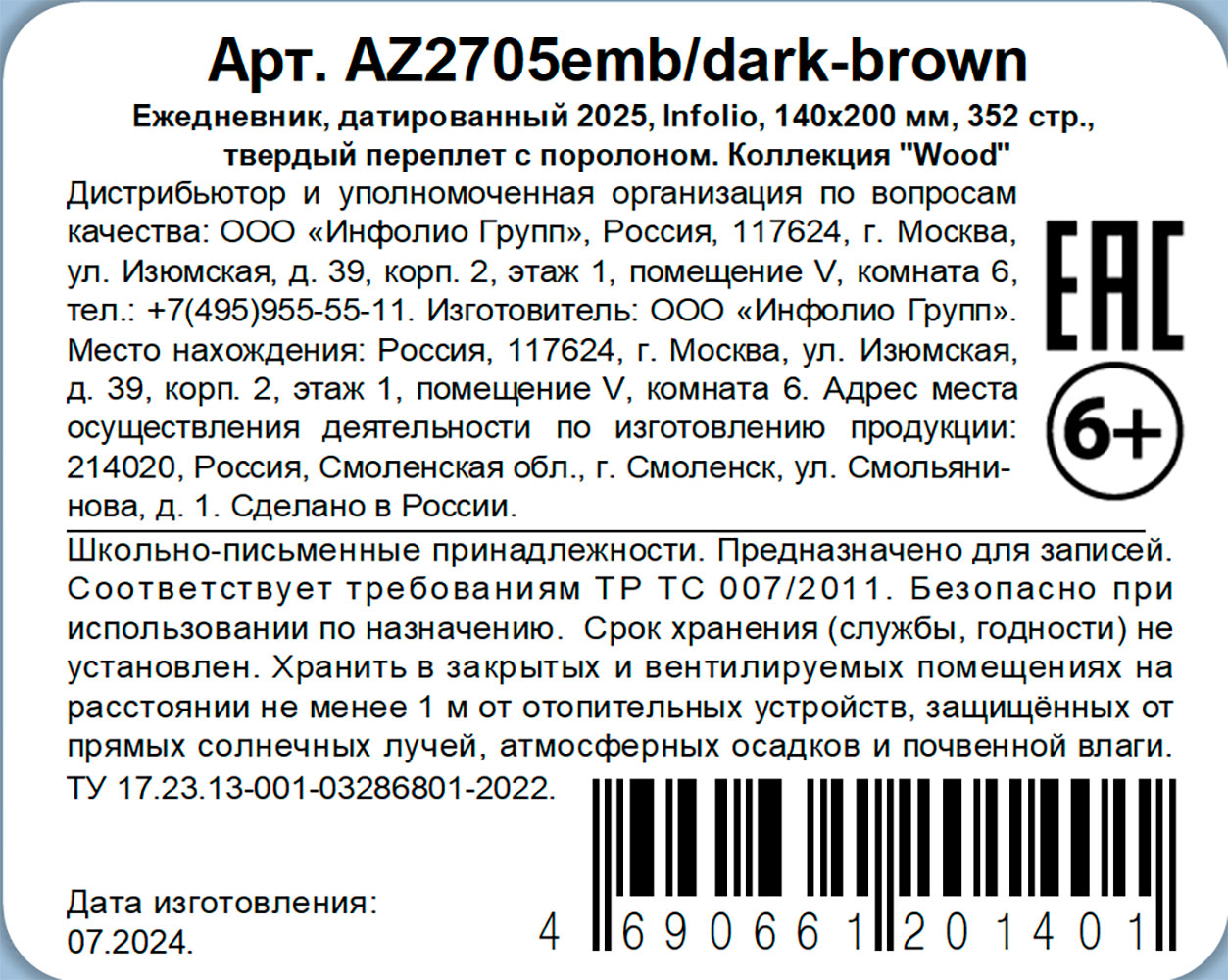Ежедневник датированный Infolio Wood A5 темно-коричневый 176 листов