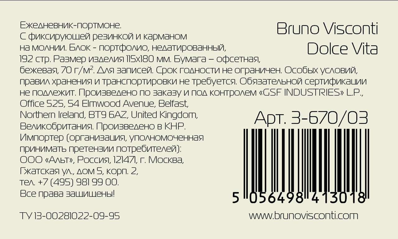 Недатированный ежедневник - многофункциональный бизнес-аксессуар для современных, динамичных, ценящих комфорт и практичность, но не забывающих об индивидуальности деловых людей. Отличная замена органайзеру и портмоне: вместимый, закрывается на молнию, удобно брать в дорогу, на переговоры, официальные мероприятия. Ежедневник выполнен из фактурной искусственной кожи, имеет декоративный шов по периметру, фиксирующую резинку, вместительный карман на молнии, украшенный металлическим шильдом, отделение для пластиковых карт, визиток. Внутренний блок ежедневника-портфолио изготовлен из бежевой бумаги плотностью 70 г/кв.м и состоит из 96 листов с линовкой и указанием времени с интервалом в один час.